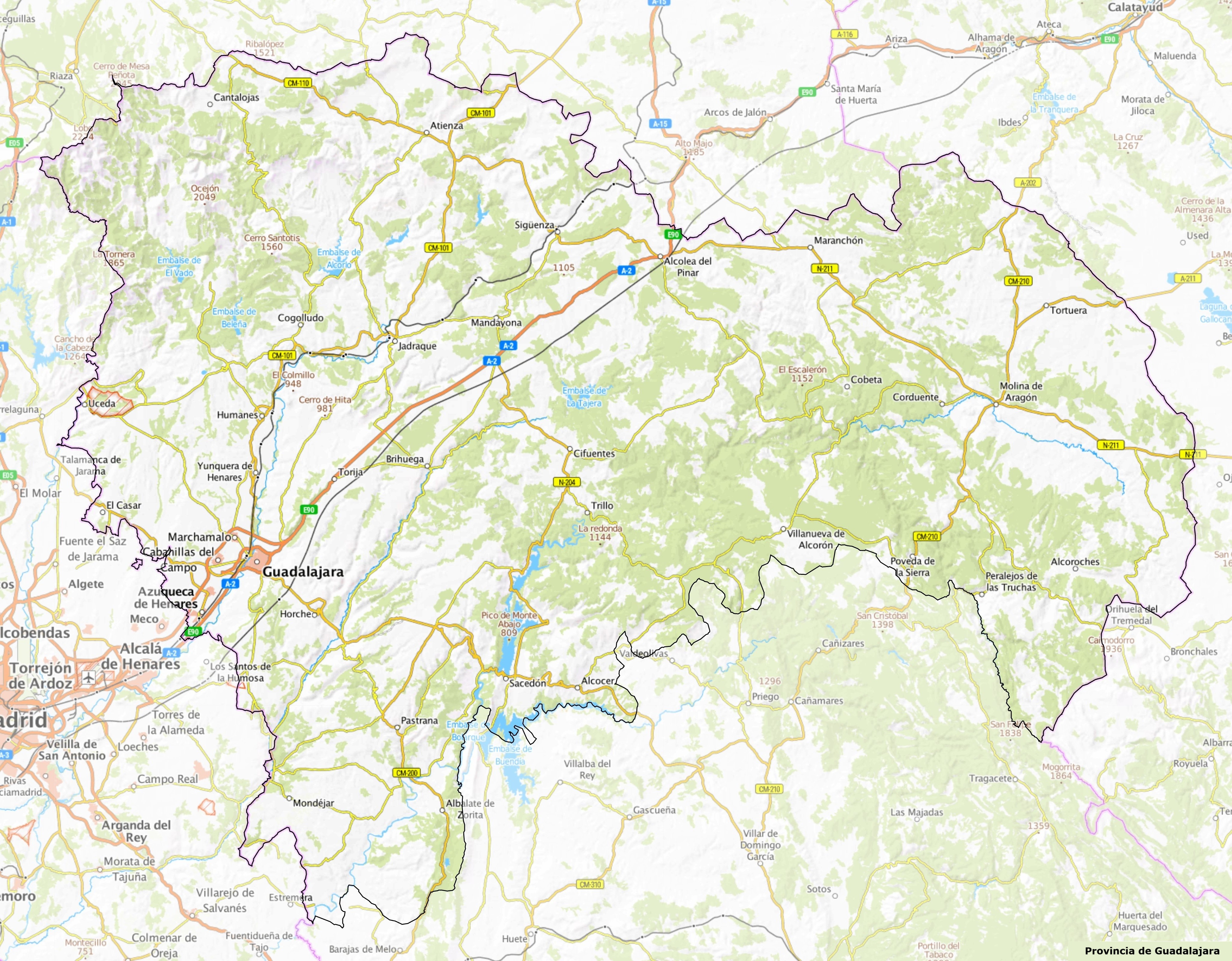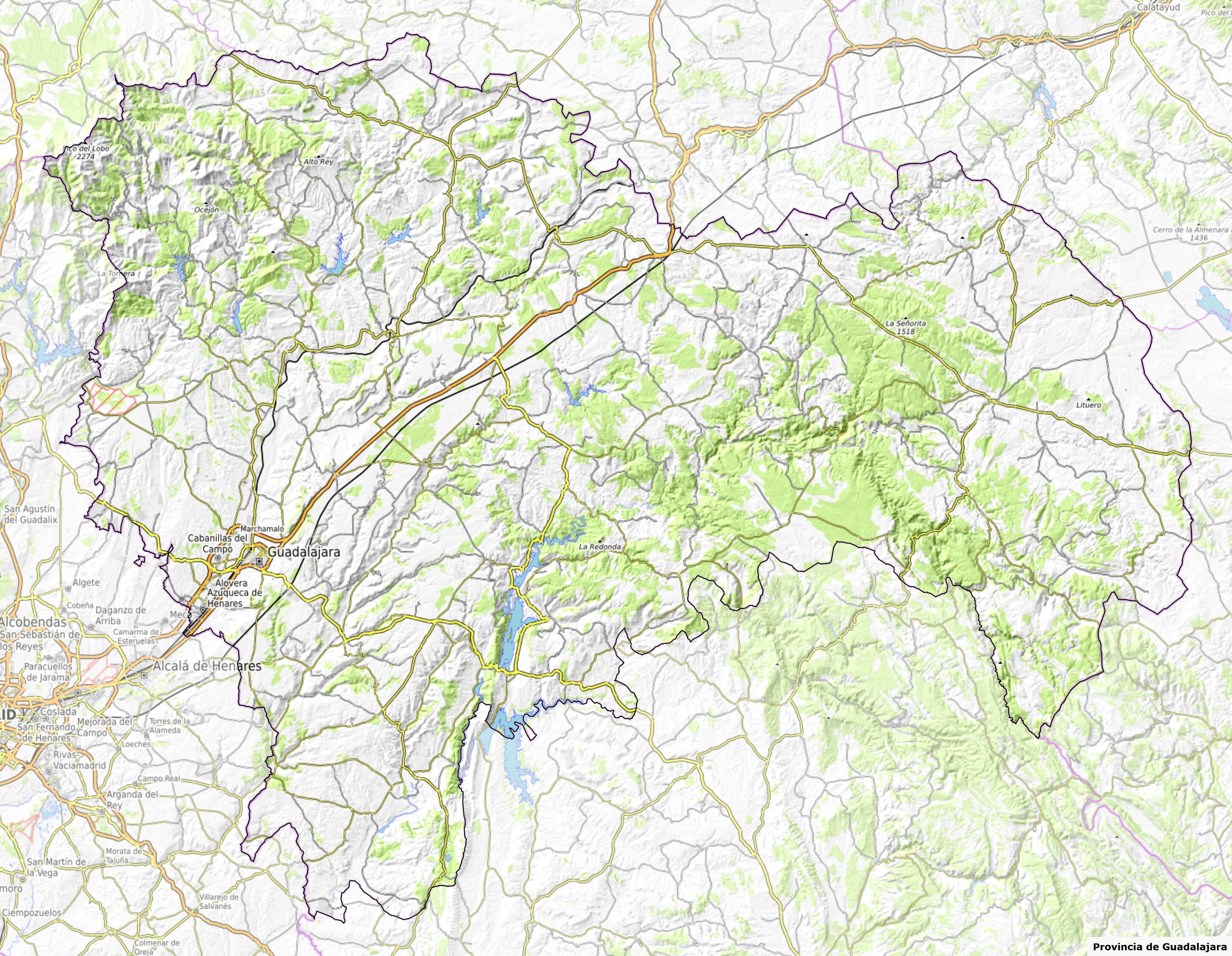 Guadalajara es una región montañosa. La parte oriental de la provincia se encuentra en el Sistema Ibérico, mientras que el Sistema Central se alza en la parte occidental. El Sistema Ibérico ocupa la parte noreste, con las Sierras de Somosierra, Ayllón, Sierra del Ocejón, Alto Rey, Bodera Barahona y Radona en sus inmediaciones. Las montañas son principalmente calizas, erosionadas por las gargantas de ríos como el Henares (con una cuenca de 3.735 kilómetros cuadrados) y el Jarama (con una cuenca de 782 kilómetros cuadrados).