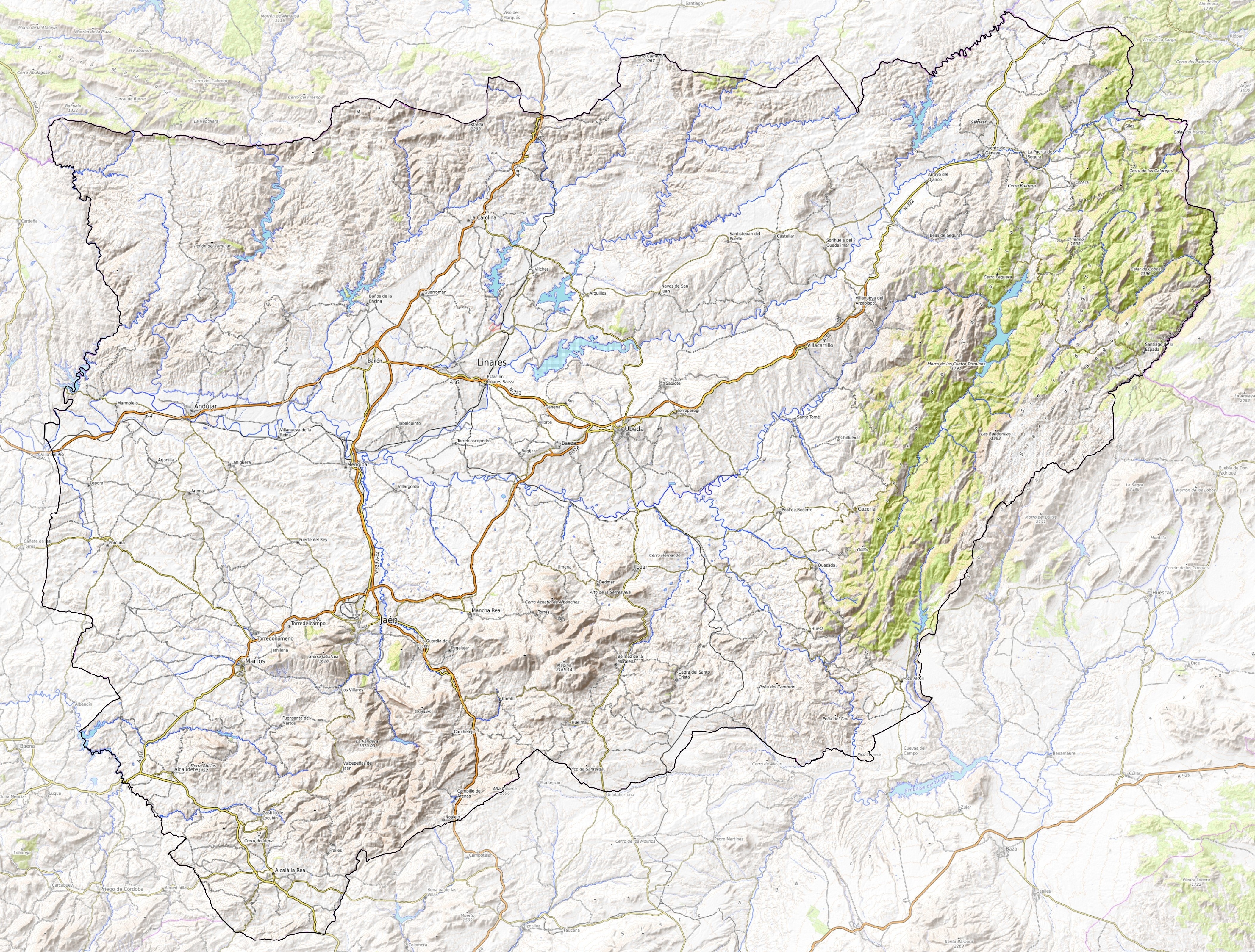 Estas últimas, tienen su continuación en Los Montes granadinos que marcan la frontera sur de la provincia. Por su parte, el límite este provincial lo marcan las sierras de Cazorla, que tiene su extensión en la granadina comarca de Huéscar, y de Segura, que continúa en la homónima región albaceteña.