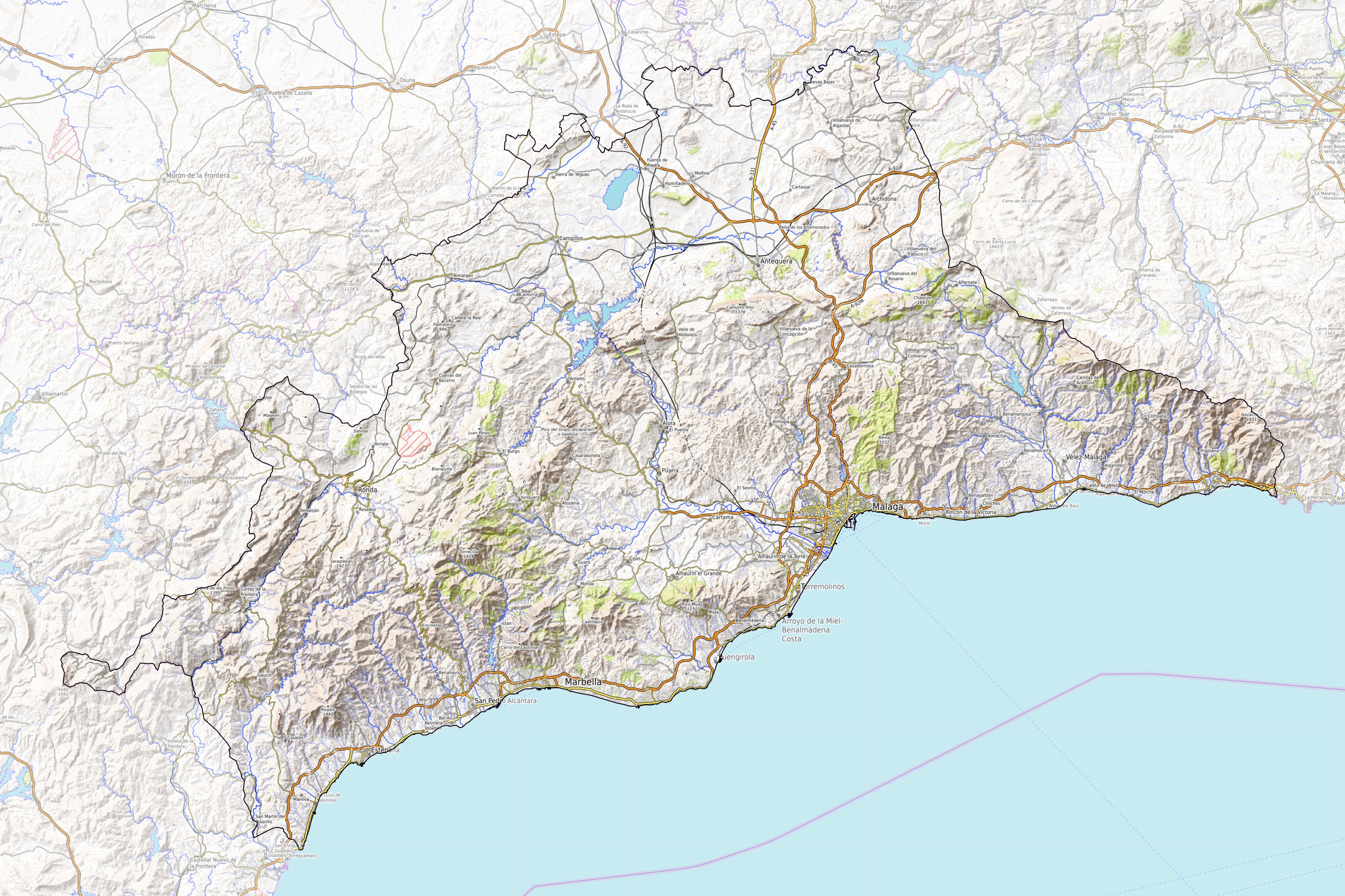 En el oeste se sitúa la Serranía de Ronda y por el este los mayores relieves son las sierras de Almijara, Tejeda y Alhama. Al sur, paralela a la Serranía de Ronda se sitúa la Sierra Bermeja.