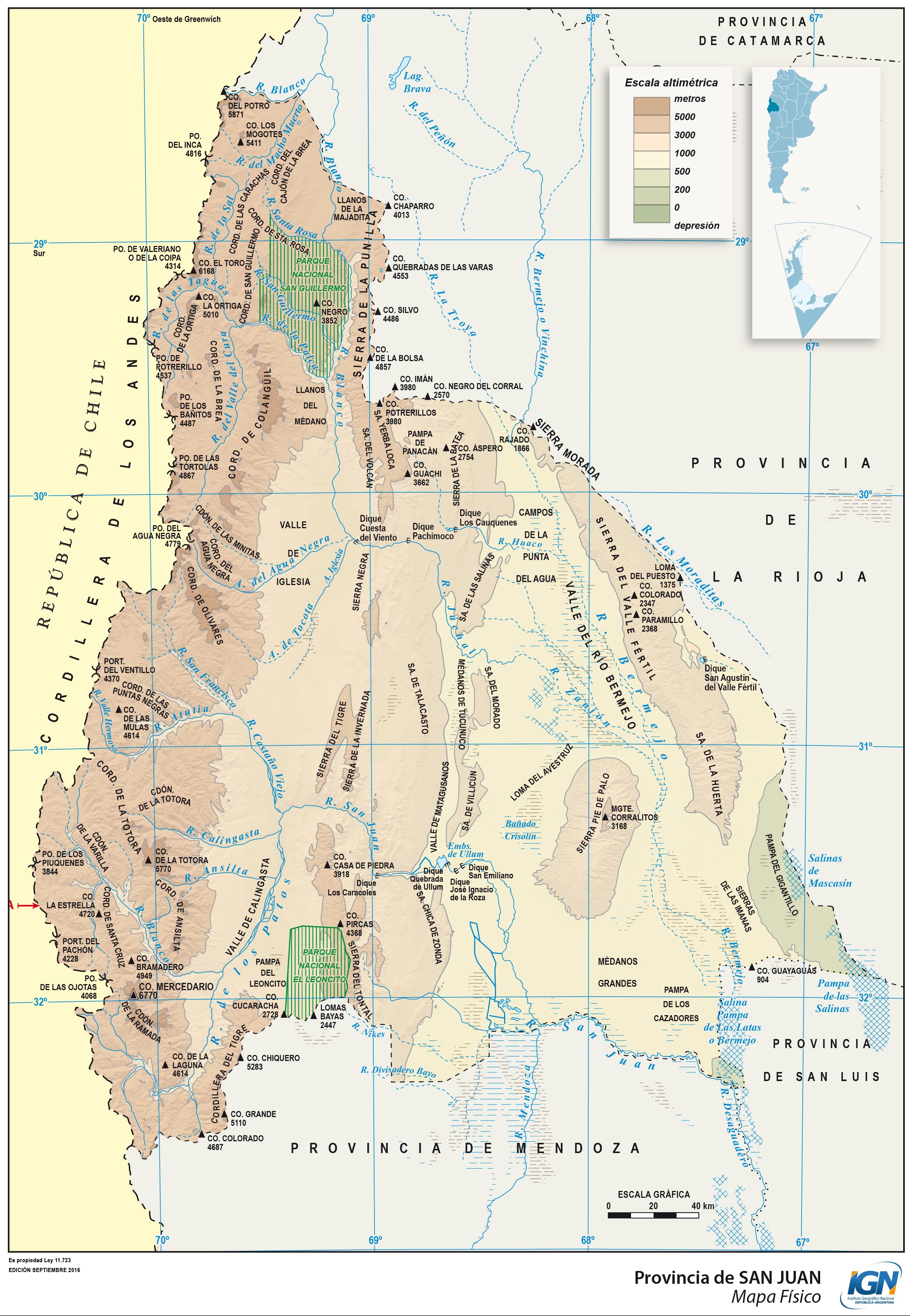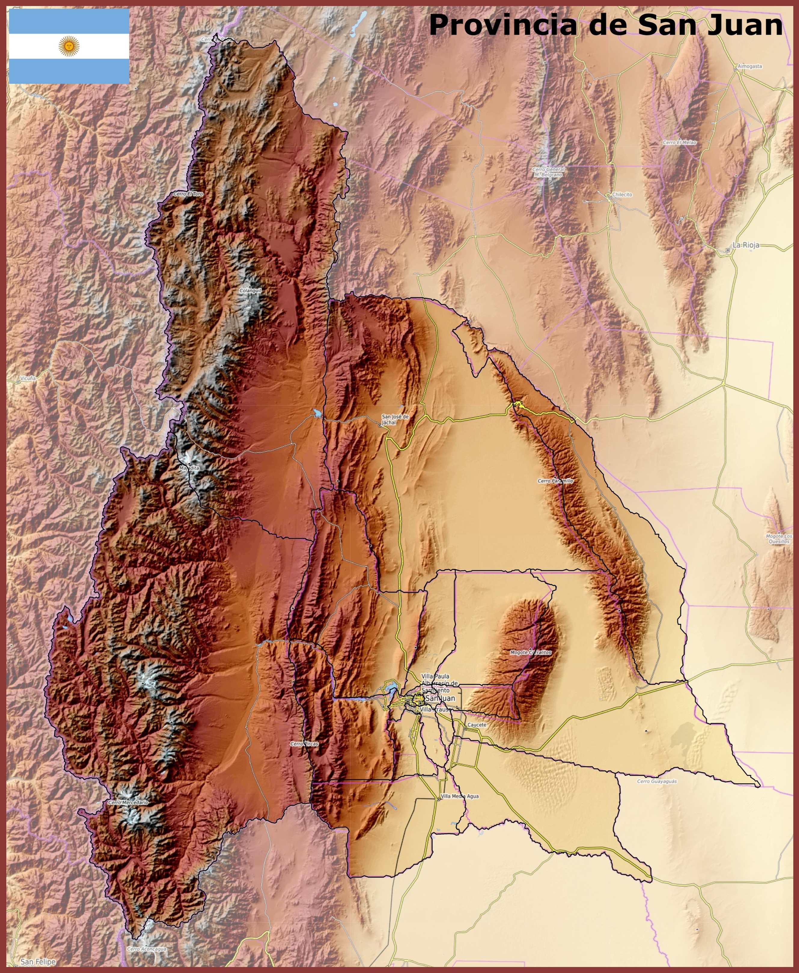 La provincia de San Juan presenta una geografía física dominada por montañas, valles áridos y oasis irrigados. Su territorio forma parte del oeste de Argentina y está profundamente influido por la cordillera de los Andes.