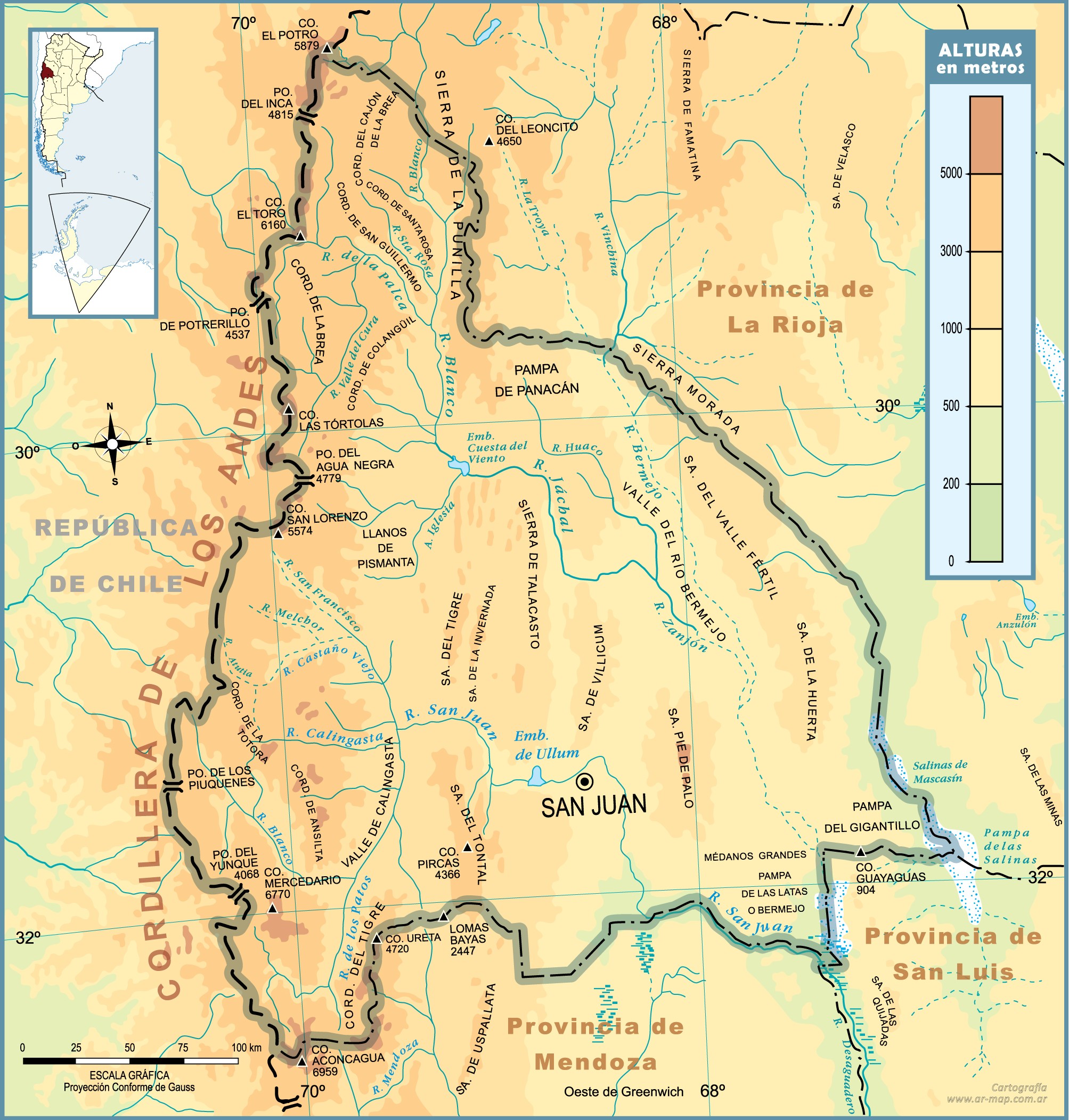 En el oeste se eleva la gran cadena andina, con algunas de las mayores alturas de América. Allí se encuentra el Cerro Mercedario, una de las cumbres más altas del continente, con más de 6.700 metros.