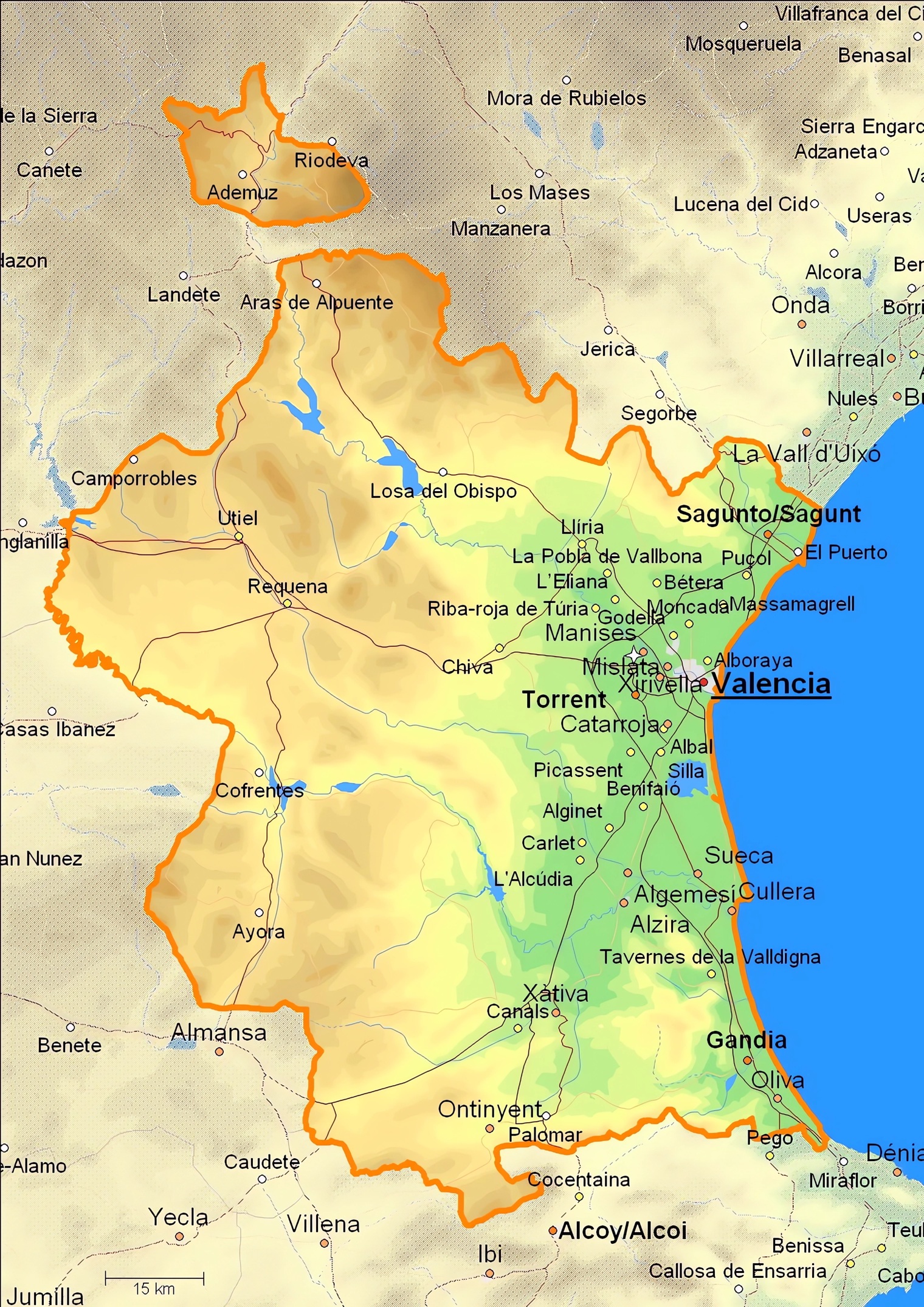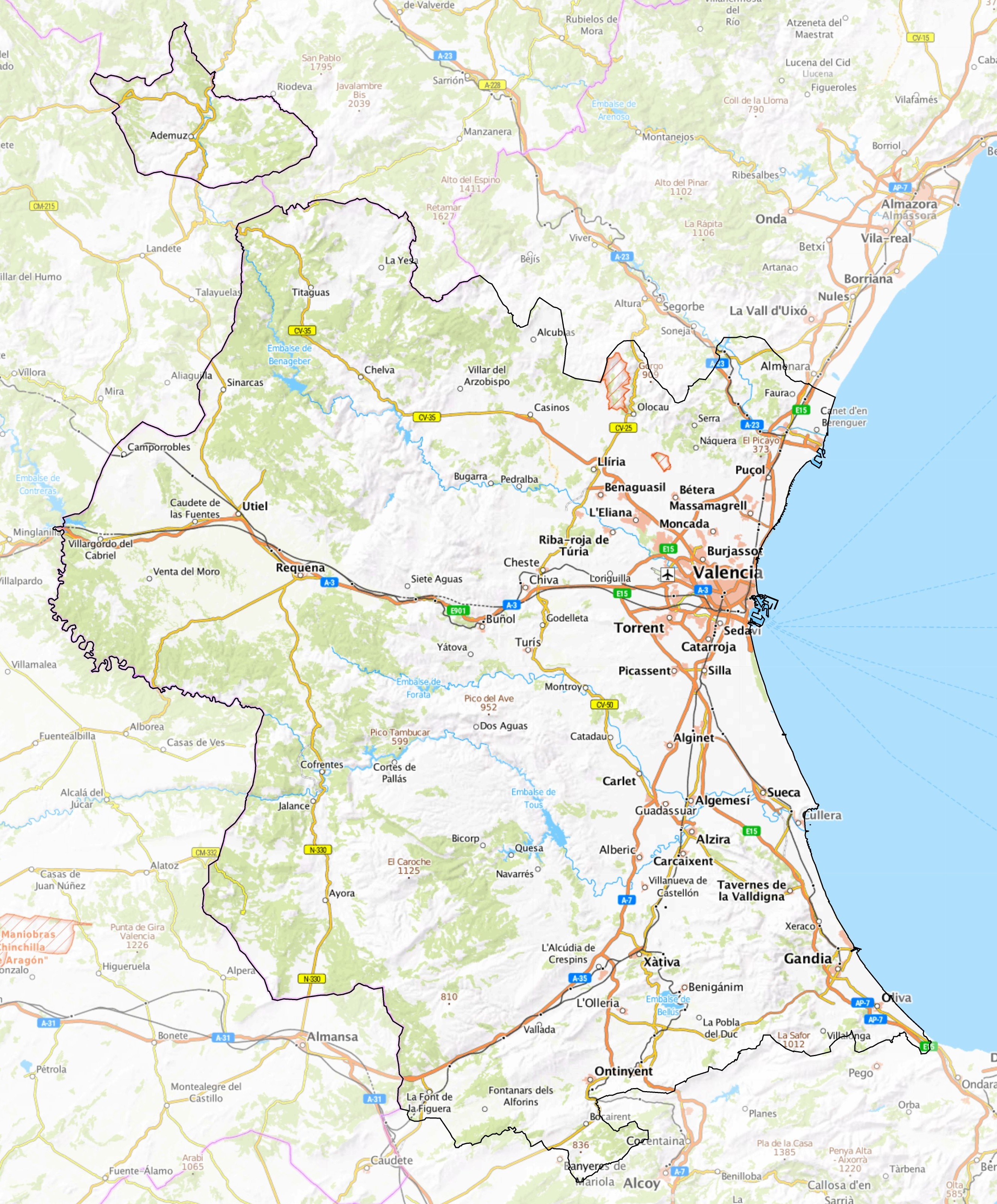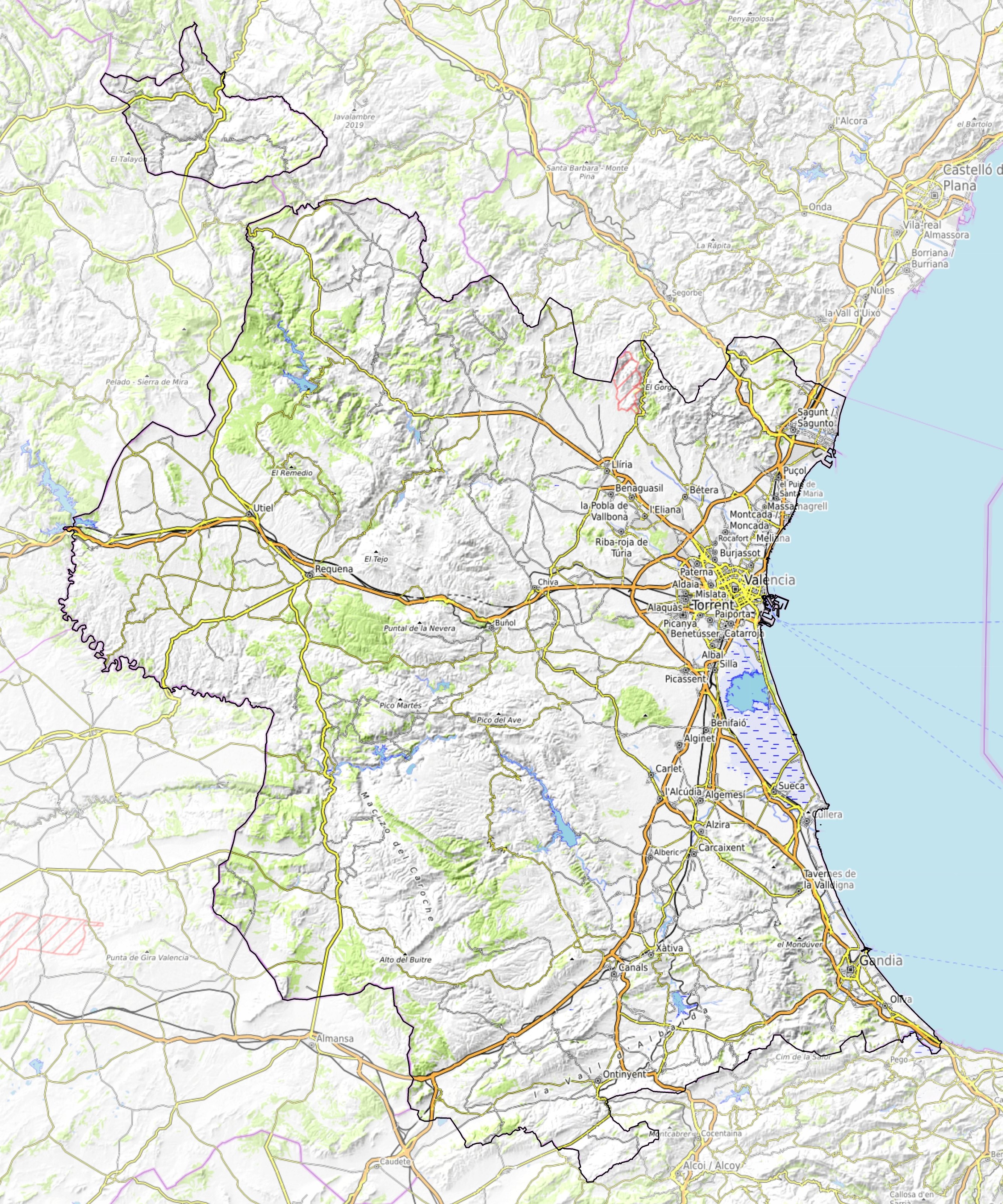 La provincia de Valencia, como el resto de la Comunidad Valenciana, tiene un interior muy montañoso donde confluyen la cordillera Ibérica de norte a sur, y las últimas estribaciones de la Bética de oeste a este. Este interior montañoso cuenta con profundos y escarpados valles, formados por los principales ríos que la atraviesan. La llanura de Valencia supone la segunda mayor llanura costera del país. Se encuentra aproximadamente entre las comarcas bajas del bajo Júcar y el Turia. En el interior también existe la peculiaridad de una meseta, el Altiplano de Requena-Utiel, que cuenta con una altura media de 750 m de altura.