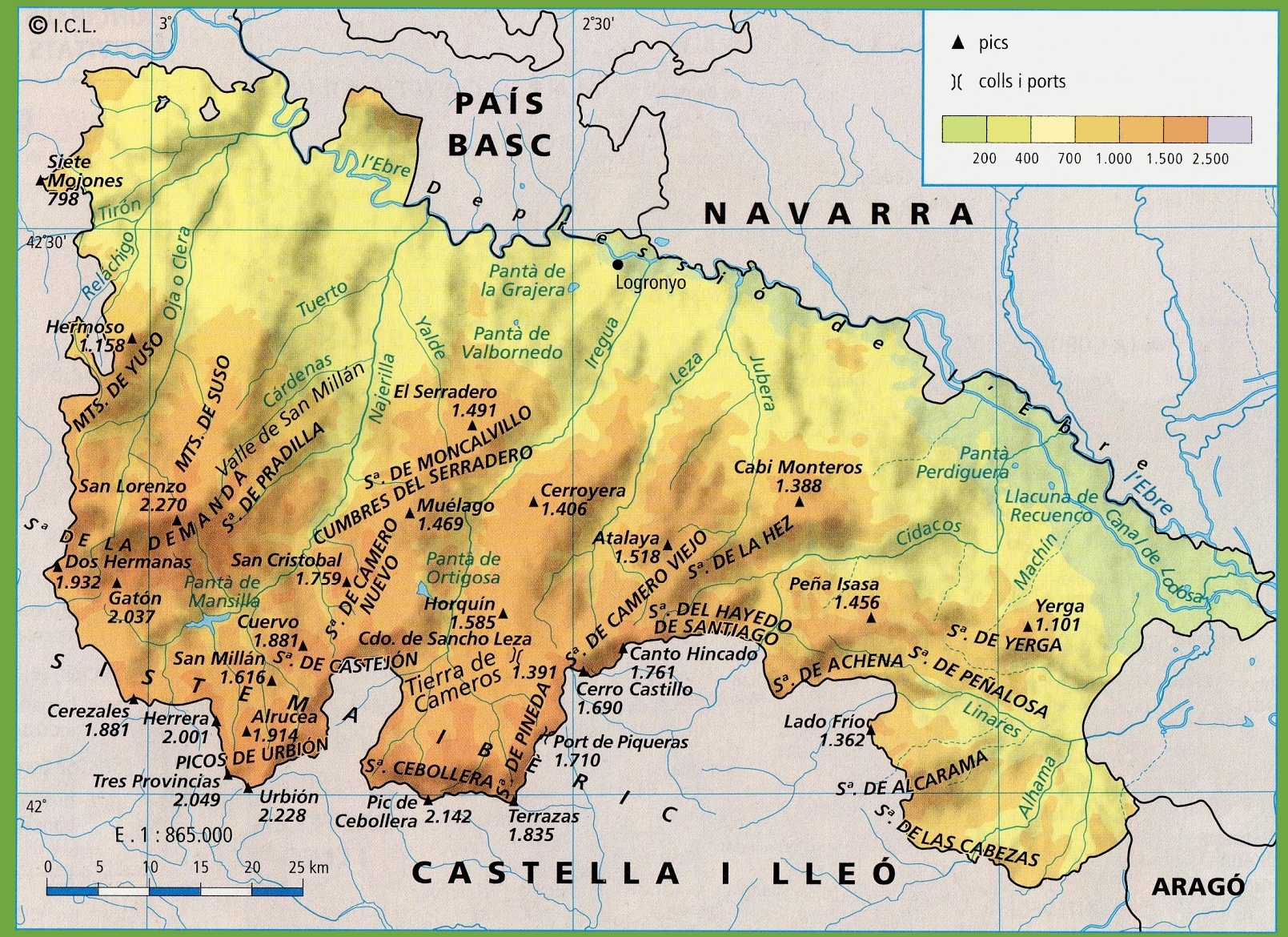 Las montañas de La Rioja forman parte del Sistema Ibérico. Esta cordillera se extiende al sur del río Ebro, paralela a él, a una distancia de entre 40 y 60 km, con altitudes que oscilan entre los 1000 y los 2000 m. Desde la cordillera, la Sierra de la Demanda se extiende hacia el norte, adentrándose en el corazón de La Rioja, incluyendo el Monte San Lorenzo, que, con 2271 m, es el pico más alto de la provincia. Otras sierras incluyen la Sierra de Camero Viejo, la Sierra de Camero Nuevo, la Sierra de Cebollera y los Picos de Urbión.
