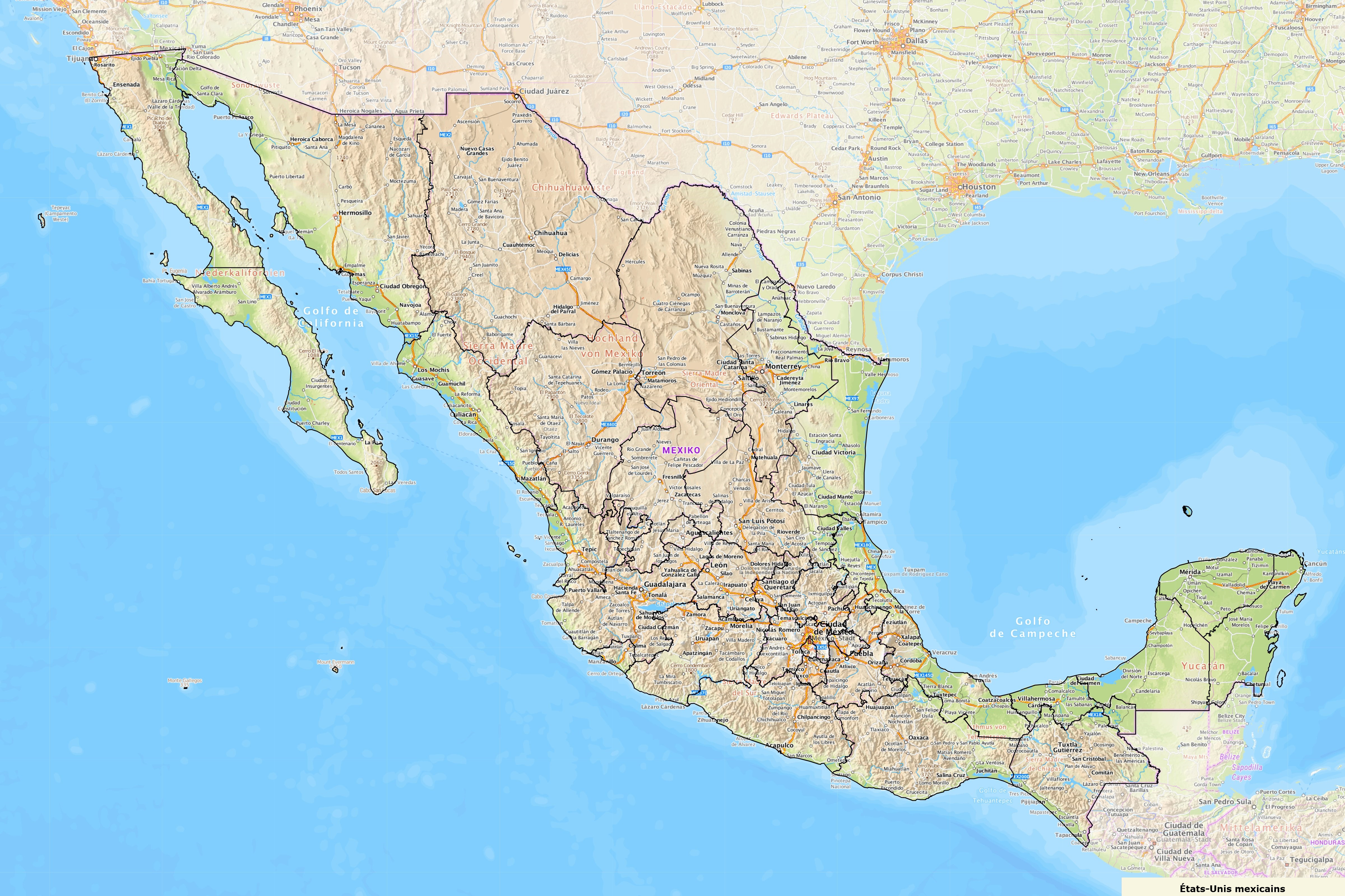 Limita al norte con Estados Unidos, al sureste con Guatemala y Belice, y está rodeado por el océano Pacífico al oeste y sur, y el golfo de México y mar Caribe al este.