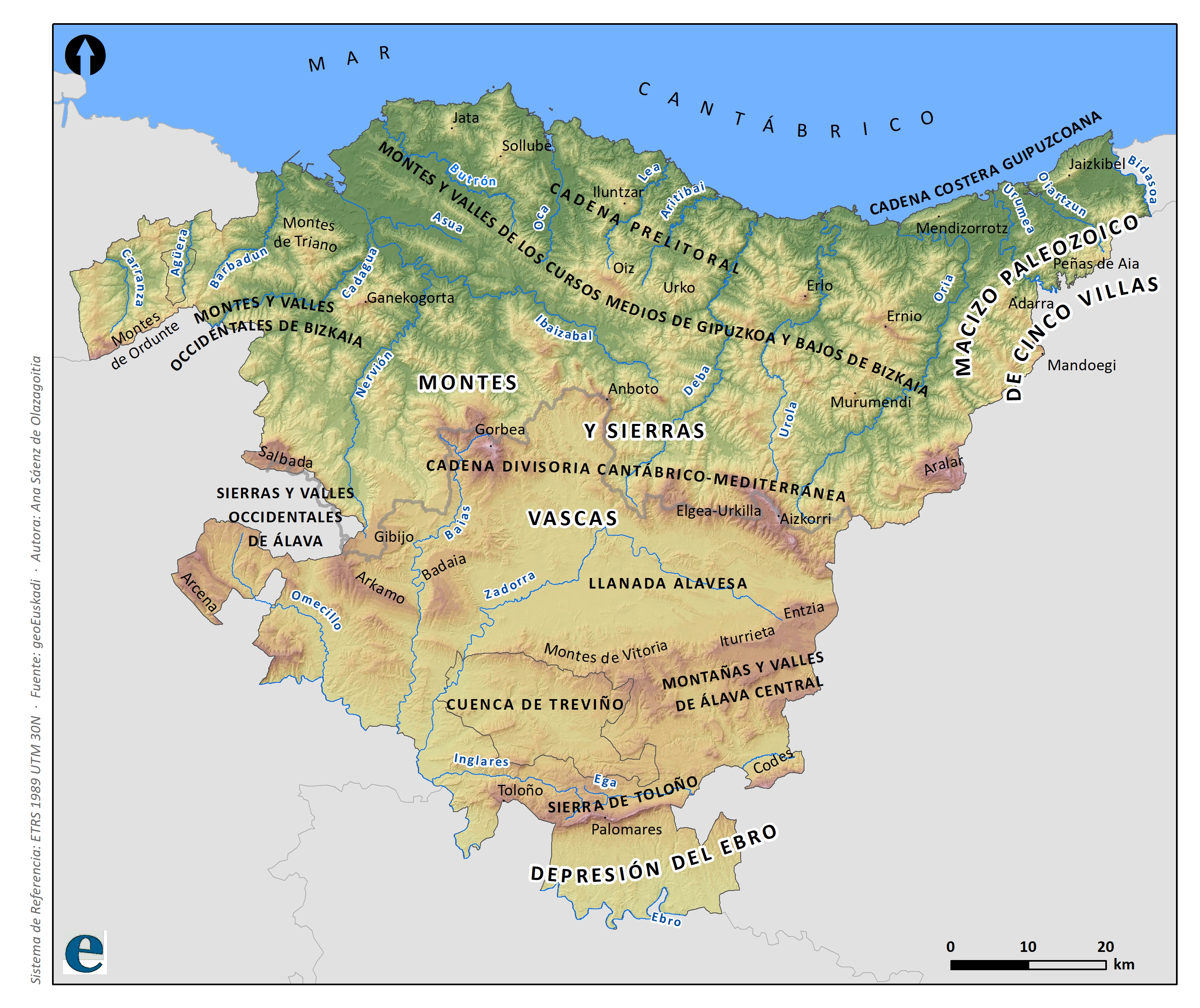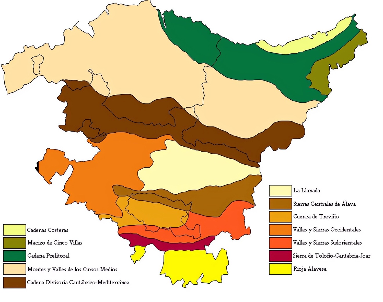 El País Vasco es montañoso. La mayoría de las montañas se extienden a lo largo de un eje este-oeste, al oeste de los Pirineos.