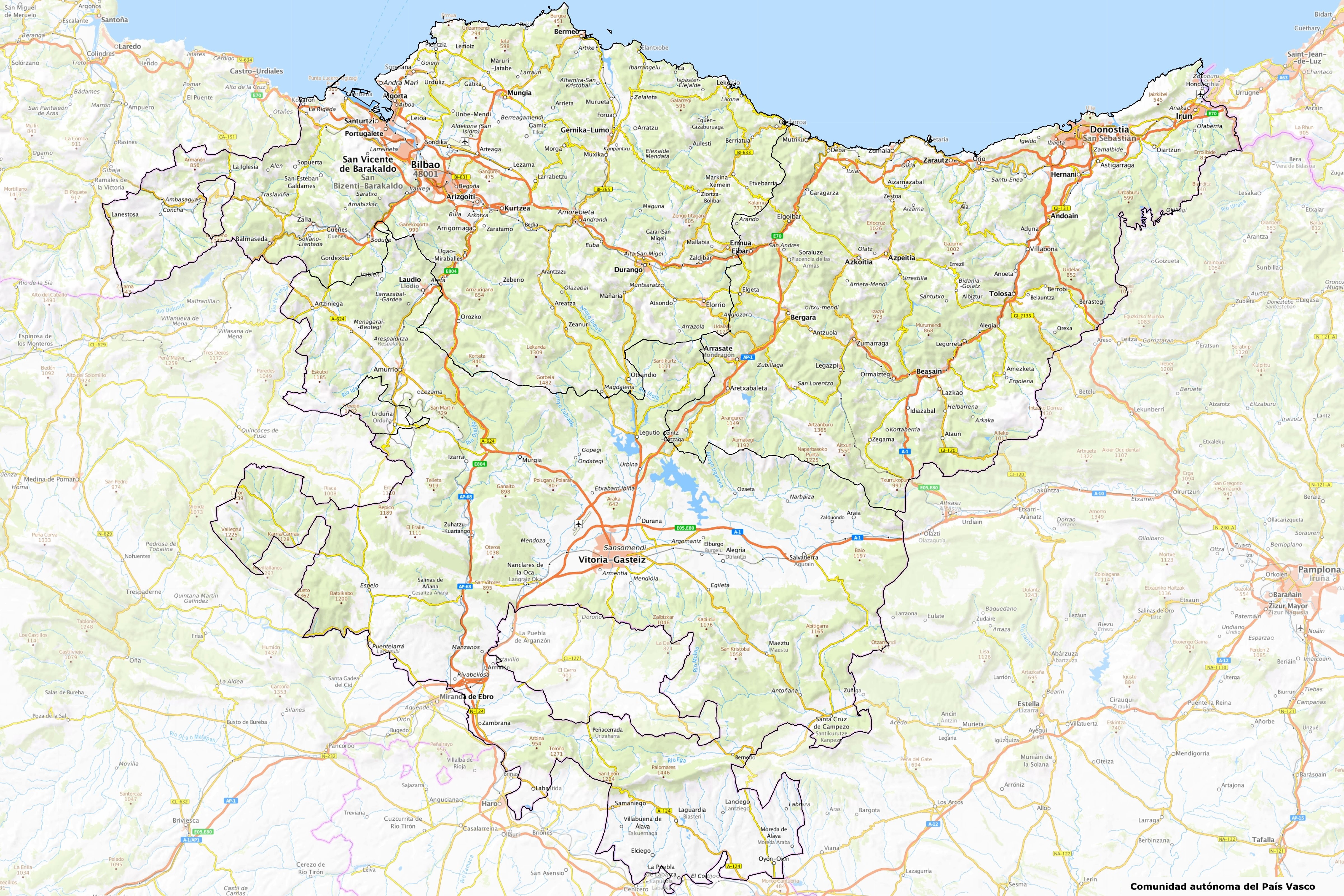 Los principales límites naturales del País Vasco son el Golfo de Vizcaya (al sureste del mar Cantábrico) al norte y al oeste, y el río Ebro al sur. El punto más alto del País Vasco es el pico Hiru Erregeen Mahaia (2438 m de altitud).