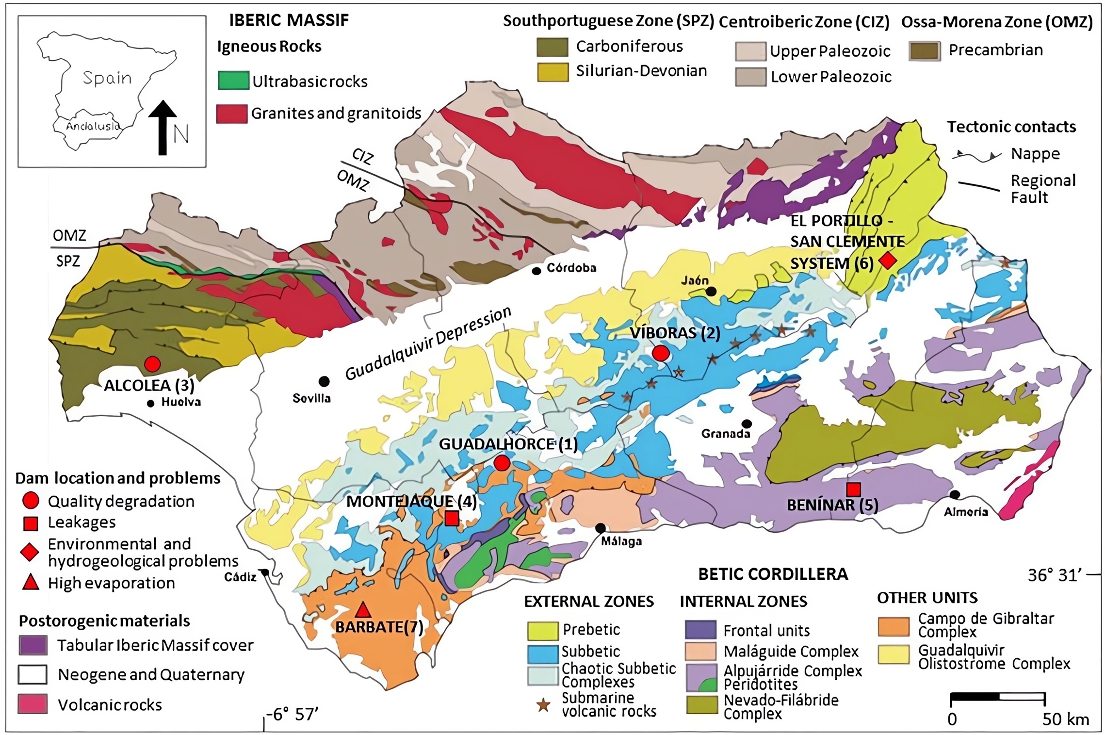 Las tres grandes unidades morfológicas que se suelen diferenciar en Andalucía (Sierra Morena, Depresión del Guadalquivir y Sierras Béticas) revelan con claridad las distintas etapas de su génesis y las profundas transformaciones que se produjeron en cada una de ellas. En Sierra Morena están los materiales geológicos de mayor antigüedad, ya que emergió en el Paleozoico Superior como zona extrema, o costera, del macizo que hoy conocemos como Meseta Ibérica. Posteriormente fue fracturada y levantada por el empuje de orogenia alpina (hace unos 30 millones de años), la misma que hizo emerger los macizos calizos Béticos. Entre uno y otro bloque quedó un corredor marino por el que se comunicaba el océano y el naciente mar Mediterráneo, que progresivamente se cerró y colmató, dando lugar a la tercera macrounidad que es la Depresión del Guadalquivir.