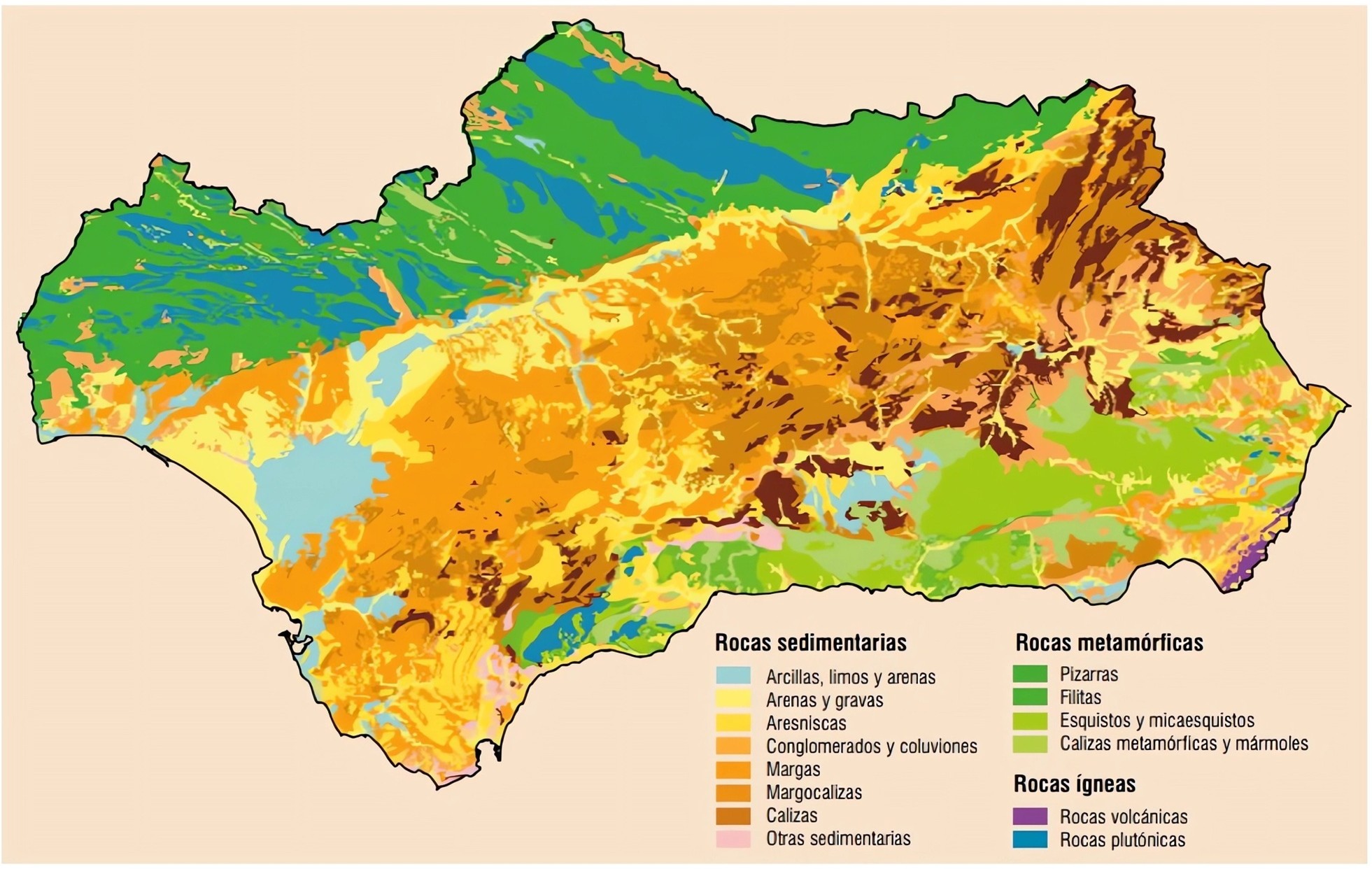 La litología o tipos de rocas es también distinta en cada una de estas unidades. El Macizo Hespérico lo forman rocas ígneas y metamórficas; la Depresión del Guadalquivir rocas sedimentarias; mientras que las de las Cordilleras Béticas son sedimentarias, metamórficas e ígneas. El relieve es una expresión más de la historia geológica, estrechamente ligado a la procedencia de los materiales y los procesos orogénicos y erosivos. Así se explican las trazas enérgicas de las sierras del sur, las más jóvenes, que contrastan con las de Sierra Morena, ya desgastadas por el paso del tiempo y la perseverancia de los agentes erosivos. Y entre ambos sistemas montañosos, las llanuras de la amplia depresión del Guadalquivir.