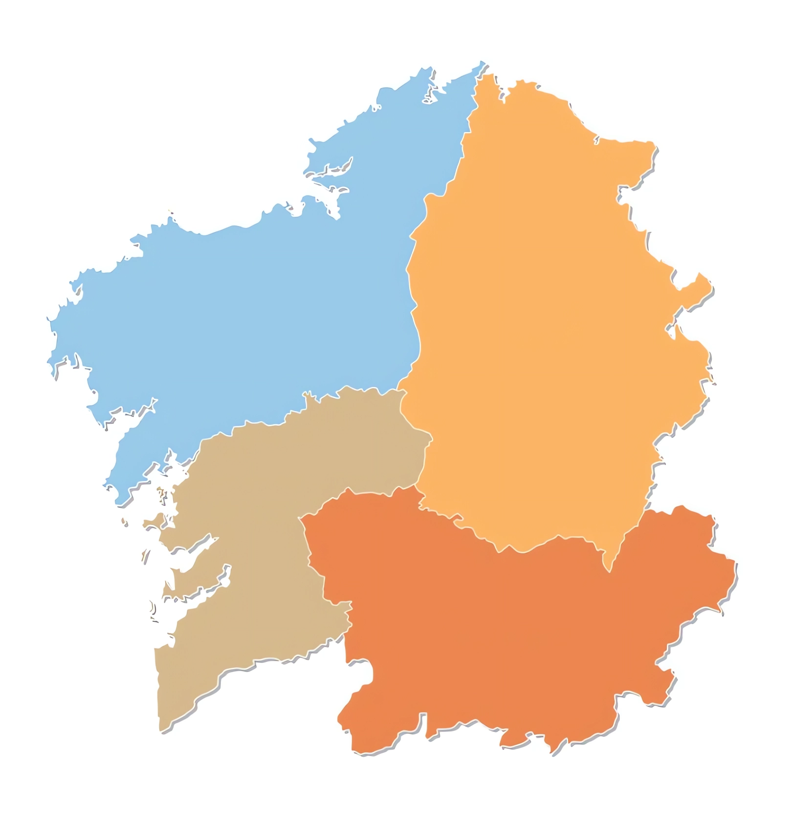 Estos mapas mudos de Galicia representan la cartografía de la comunidad autónoma, pero sin ningún tipo de etiquetado. Estos mapas en blanco se pueden utilizar, por ejemplo, en el ámbito de la educación. Pueden servir como base para muchos mapas más elaborados.