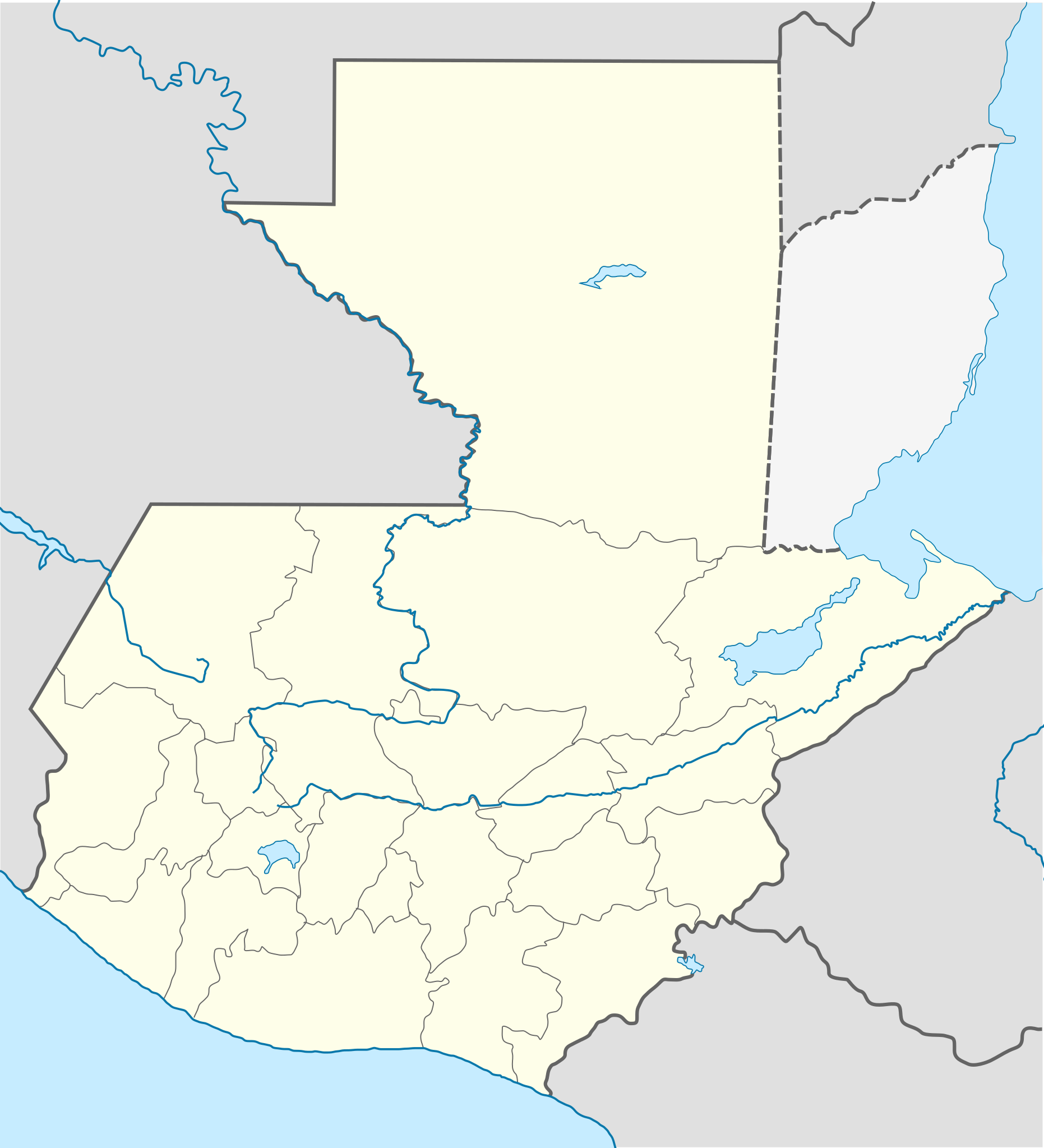 Estos mapas mudos de Guatemala representan la cartografía del país, pero sin ningún tipo de etiquetado. Estos mapas en blanco se pueden utilizar, por ejemplo, en el ámbito de la educación. Pueden servir como base para muchos mapas más elaborados.
