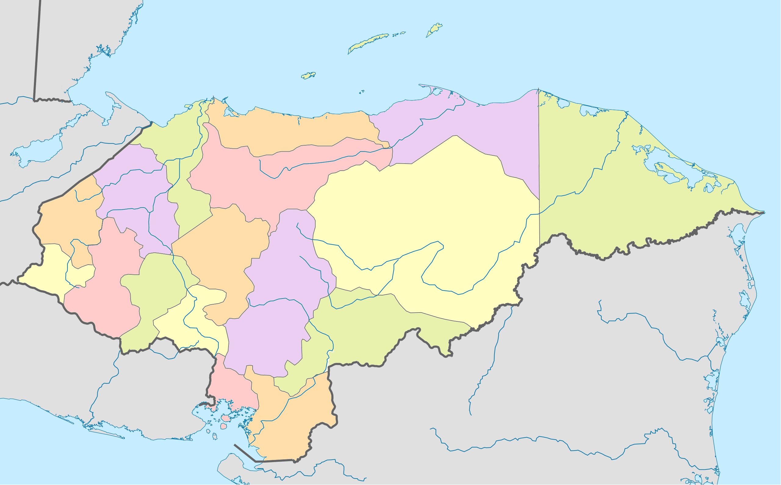 Estos mapas mudos de Honduras representan la cartografía del país, pero sin ningún tipo de etiquetado. Estos mapas en blanco se pueden utilizar, por ejemplo, en el ámbito de la educación. Pueden servir como base para muchos mapas más elaborados.