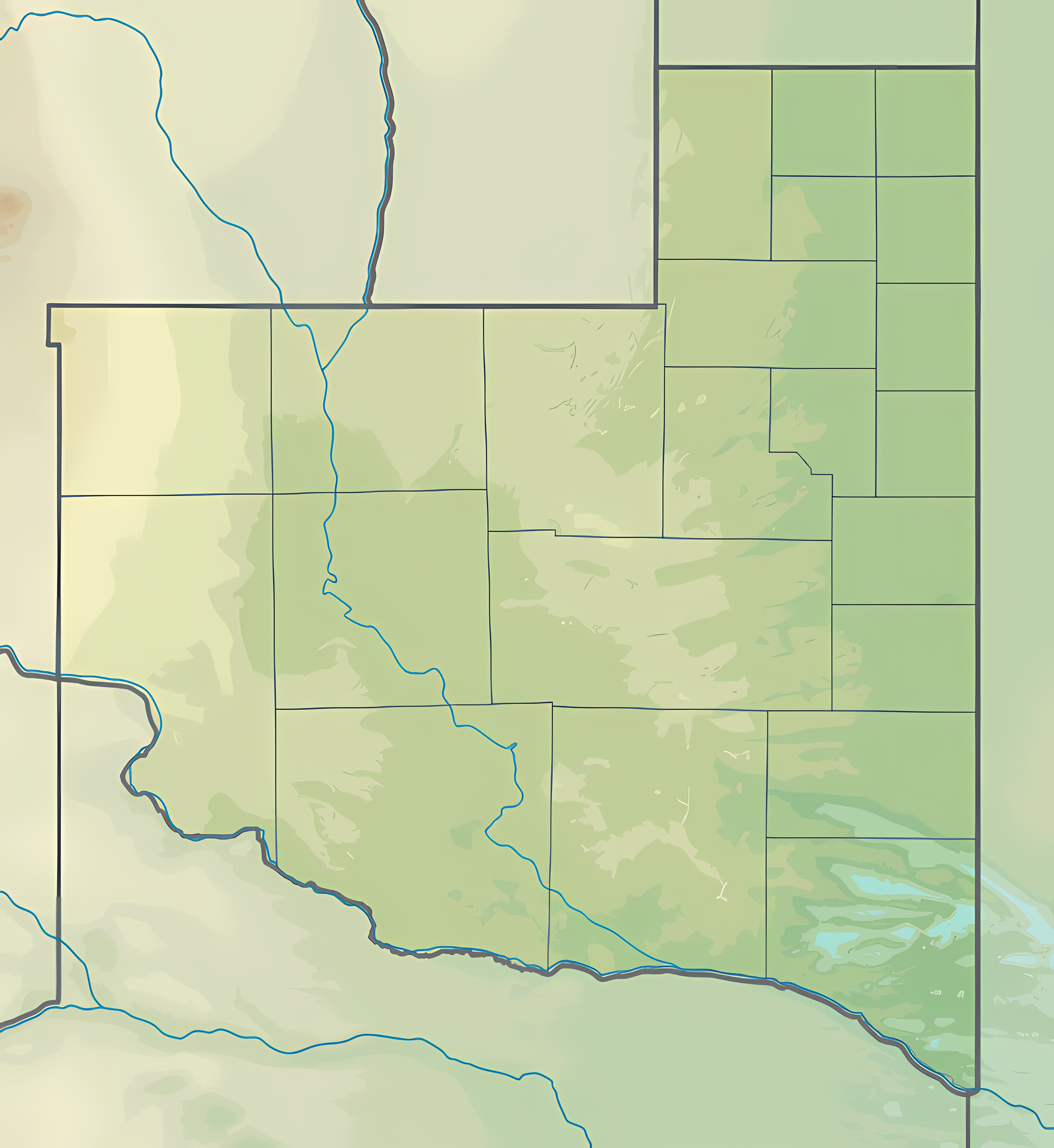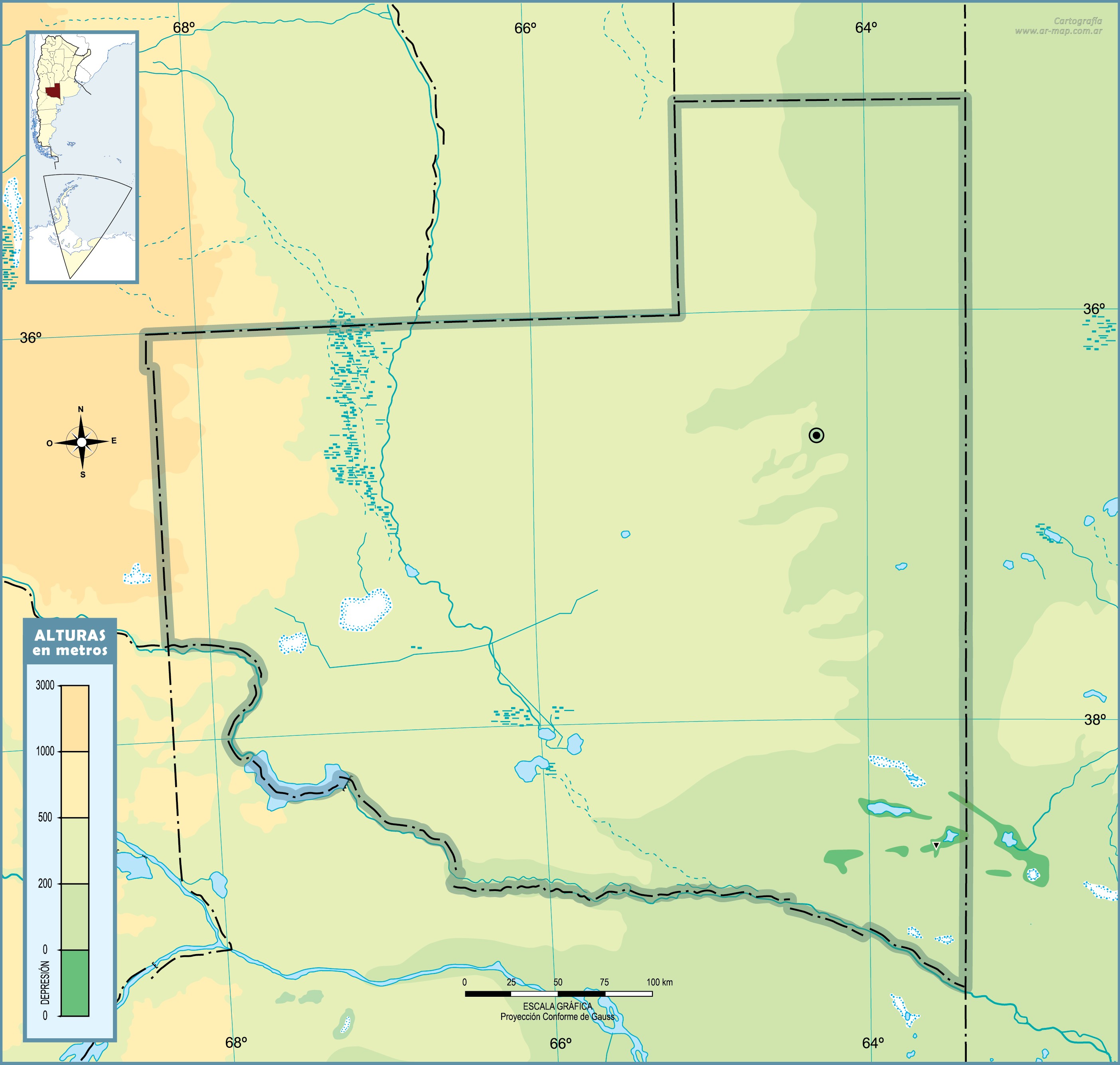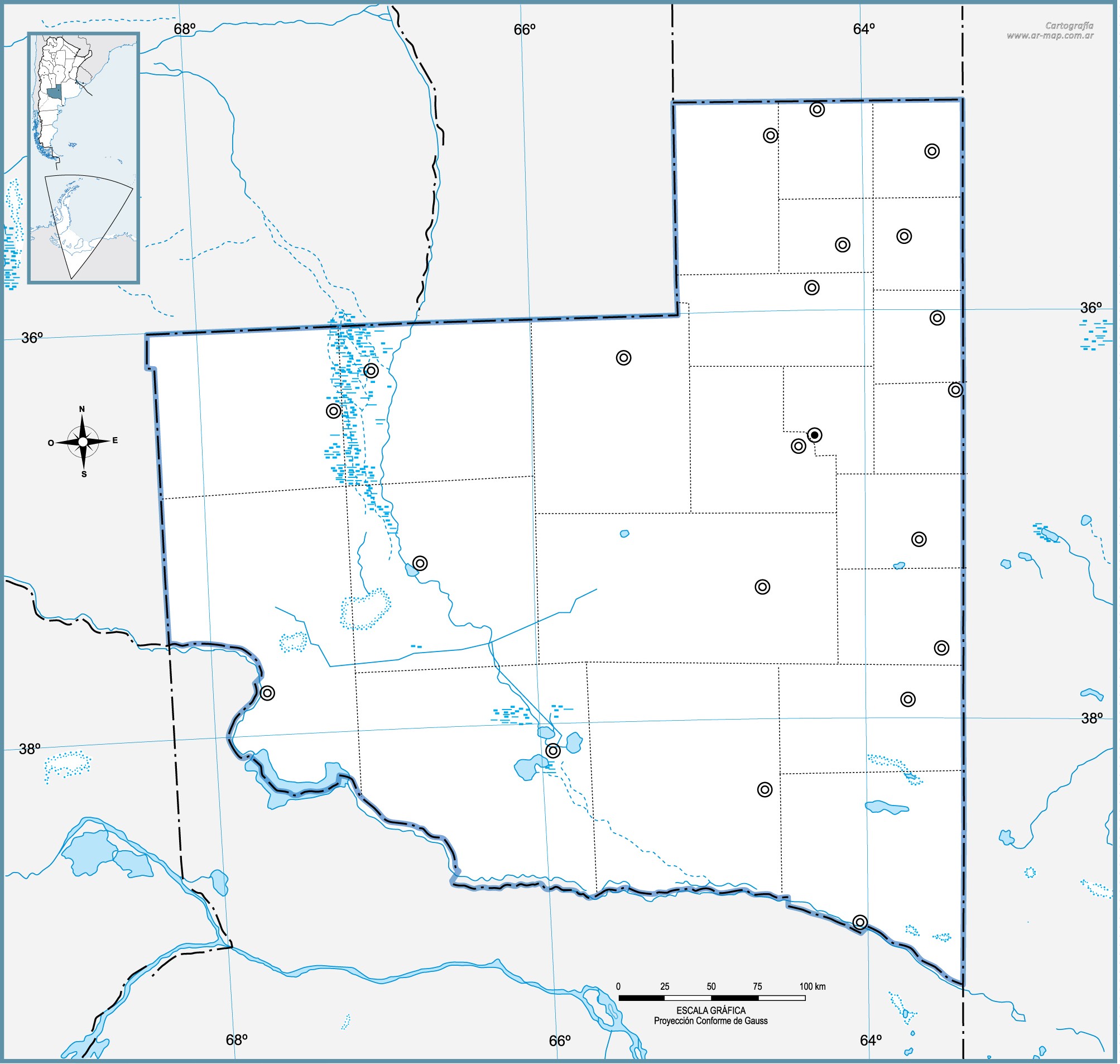 Estos mapas mudos de la provincia de La Pampa representan la cartografía de la provincia, pero sin ningún tipo de etiquetado. Estos mapas en blanco se pueden utilizar, por ejemplo, en el ámbito de la educación. Pueden servir como base para muchos mapas más elaborados.