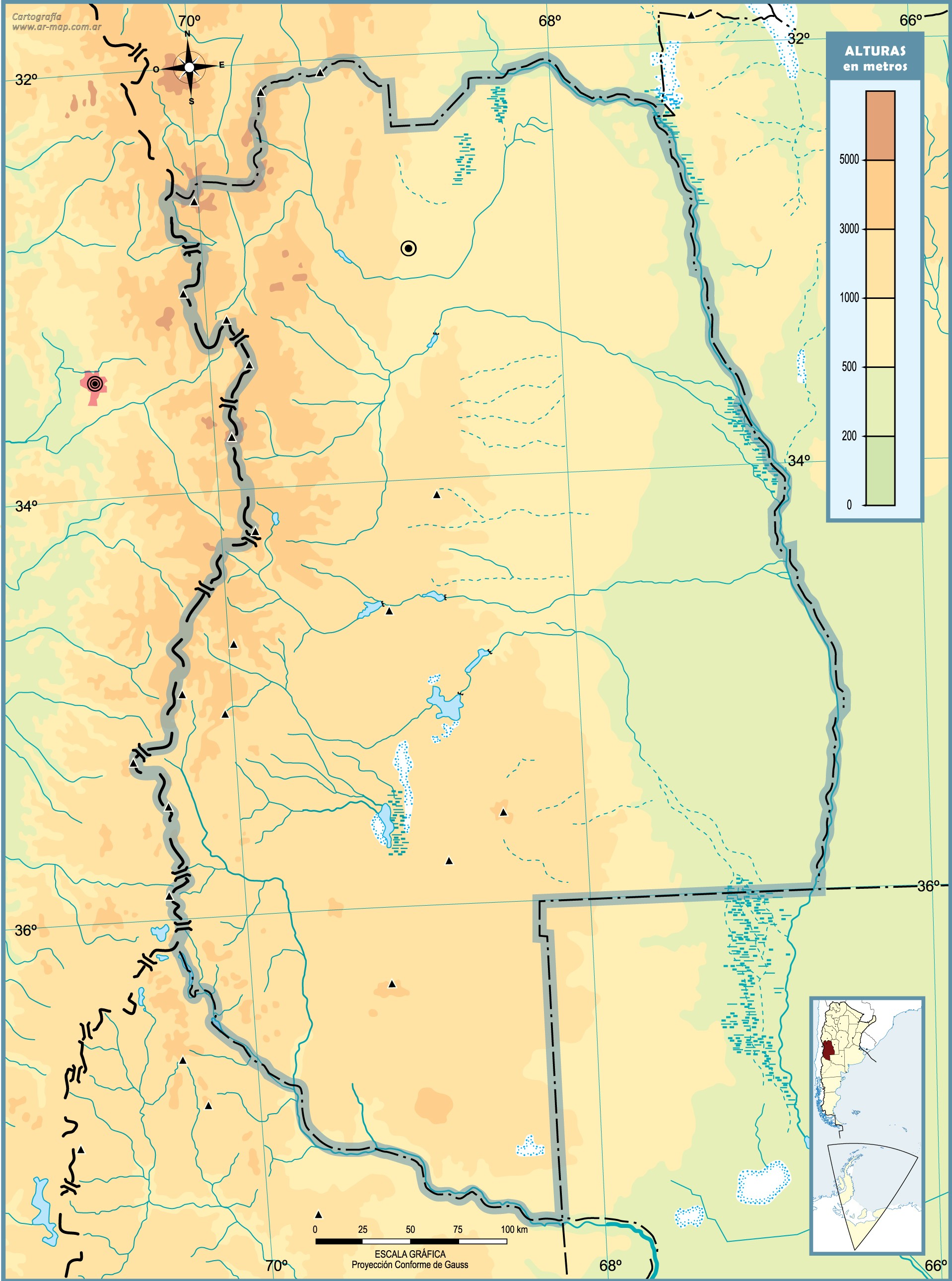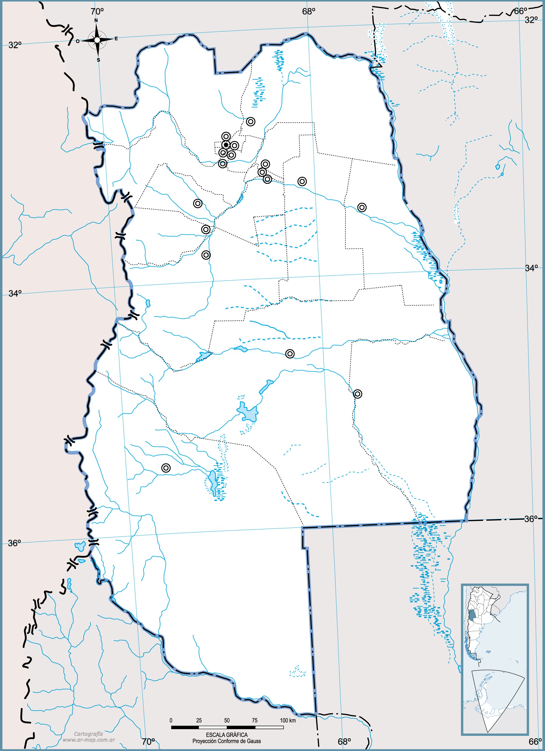Estos mapas mudos de la provincia de Mendoza representan la cartografía de la provincia, pero sin ningún tipo de etiquetado. Estos mapas en blanco se pueden utilizar, por ejemplo, en el ámbito de la educación. Pueden servir como base para muchos mapas más elaborados.