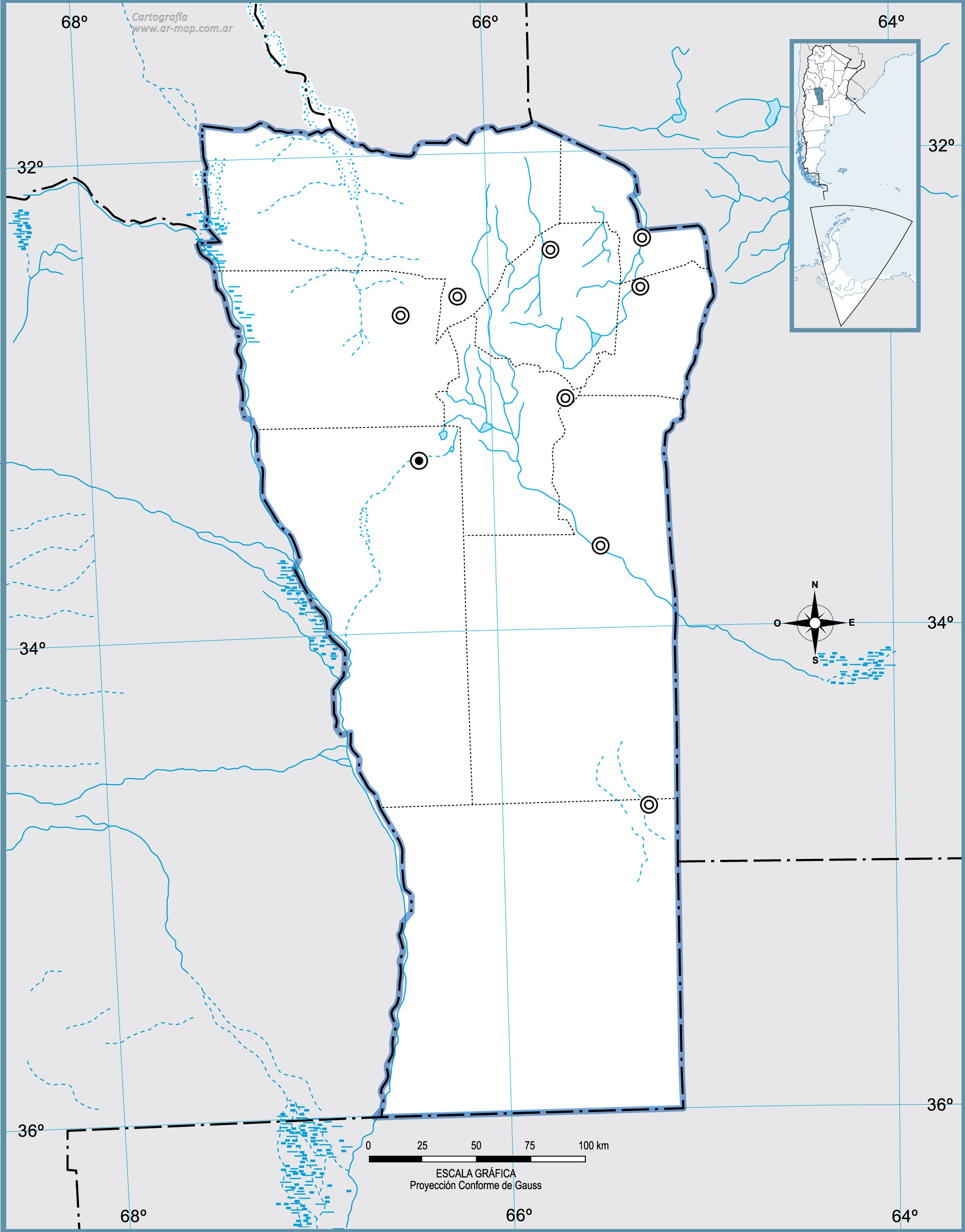 Estos mapas mudos de la provincia de San Luis representan la cartografía de la provincia, pero sin ningún tipo de etiquetado. Estos mapas en blanco se pueden utilizar, por ejemplo, en el ámbito de la educación. Pueden servir como base para muchos mapas más elaborados.