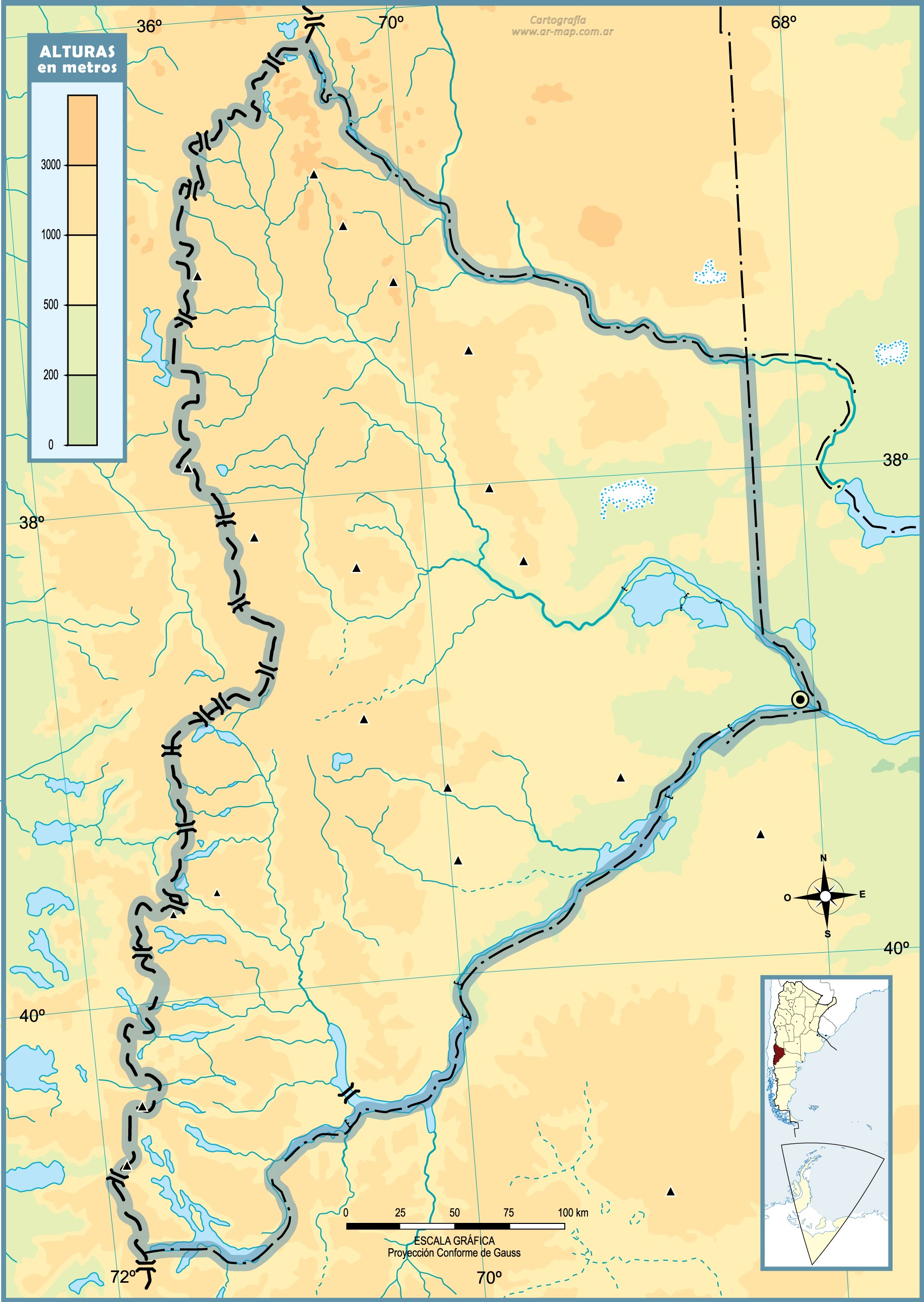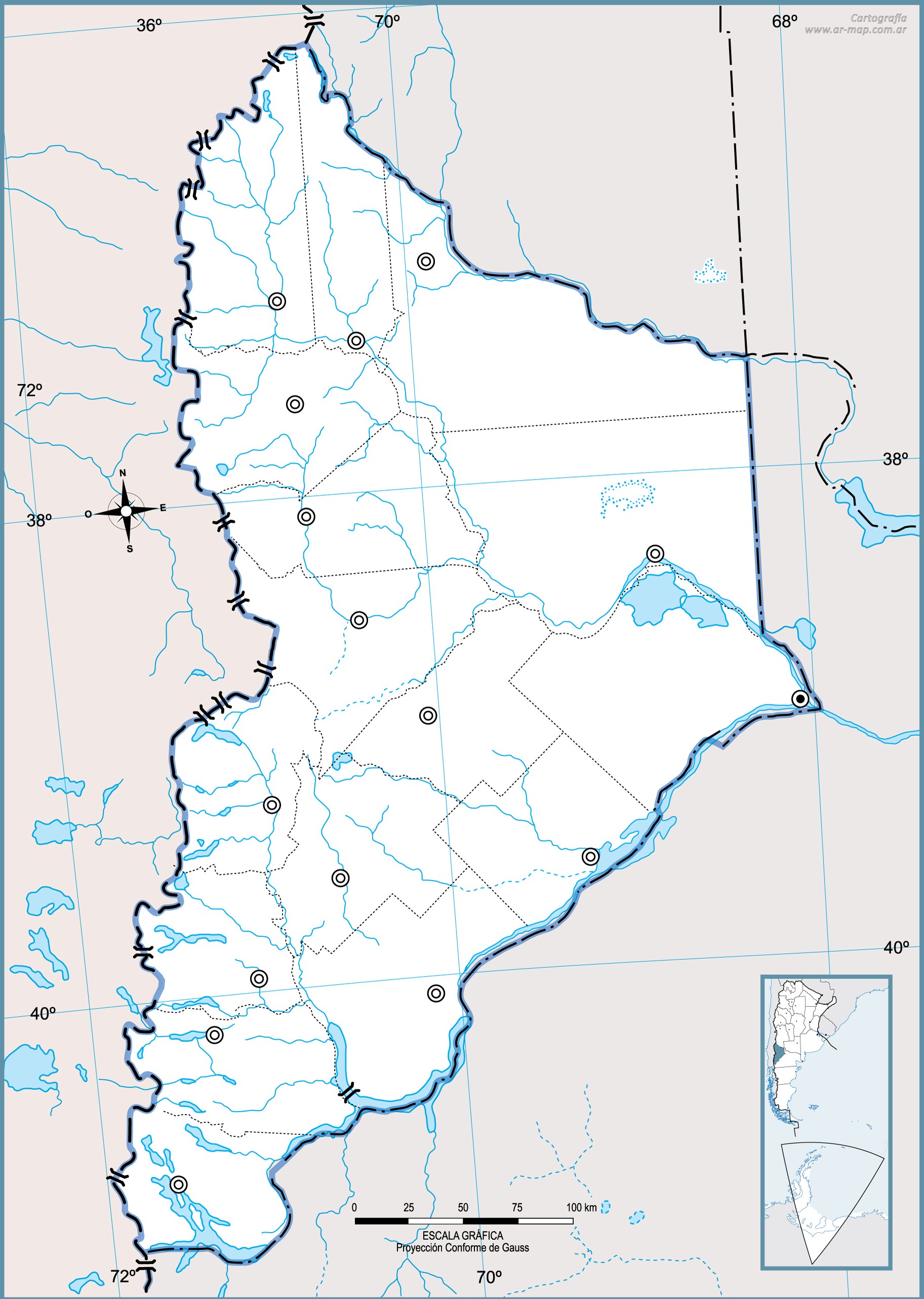 Estos mapas mudos de la provincia del Neuquén representan la cartografía de la provincia, pero sin ningún tipo de etiquetado. Estos mapas en blanco se pueden utilizar, por ejemplo, en el ámbito de la educación. Pueden servir como base para muchos mapas más elaborados.