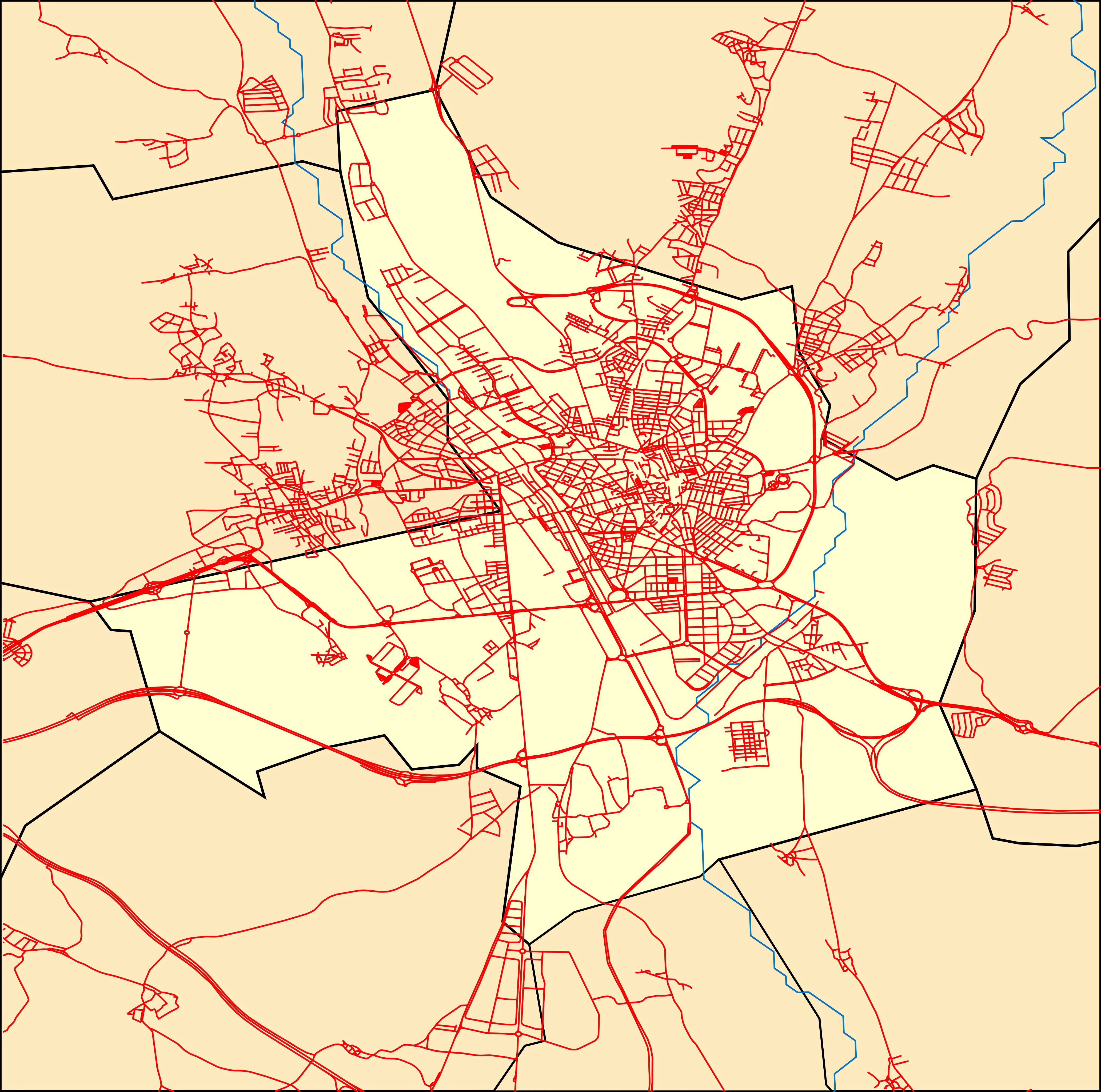 Este mapa mudo de León representa la cartografía de la ciudad, pero sin ningún tipo de etiquetado. Este mapa en blanco puede utilizarse, por ejemplo, en el ámbito educativo. Puede servir como base para muchos mapas más elaborados.
