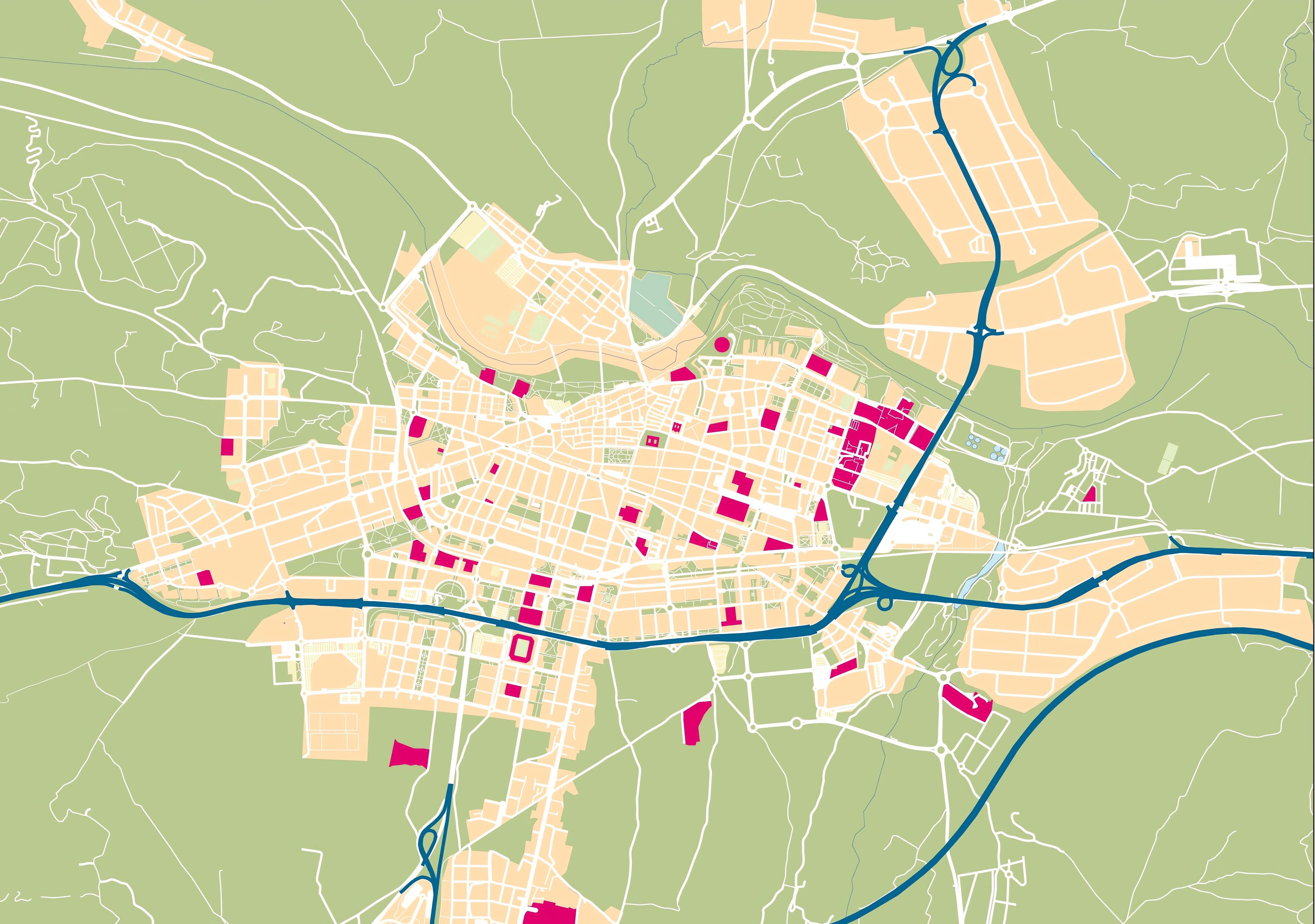 Este mapa mudo de Logroño representa la cartografía de la ciudad, pero sin ningún tipo de etiquetado. Este mapa en blanco puede utilizarse, por ejemplo, en el ámbito educativo. Puede servir como base para muchos mapas más elaborados.