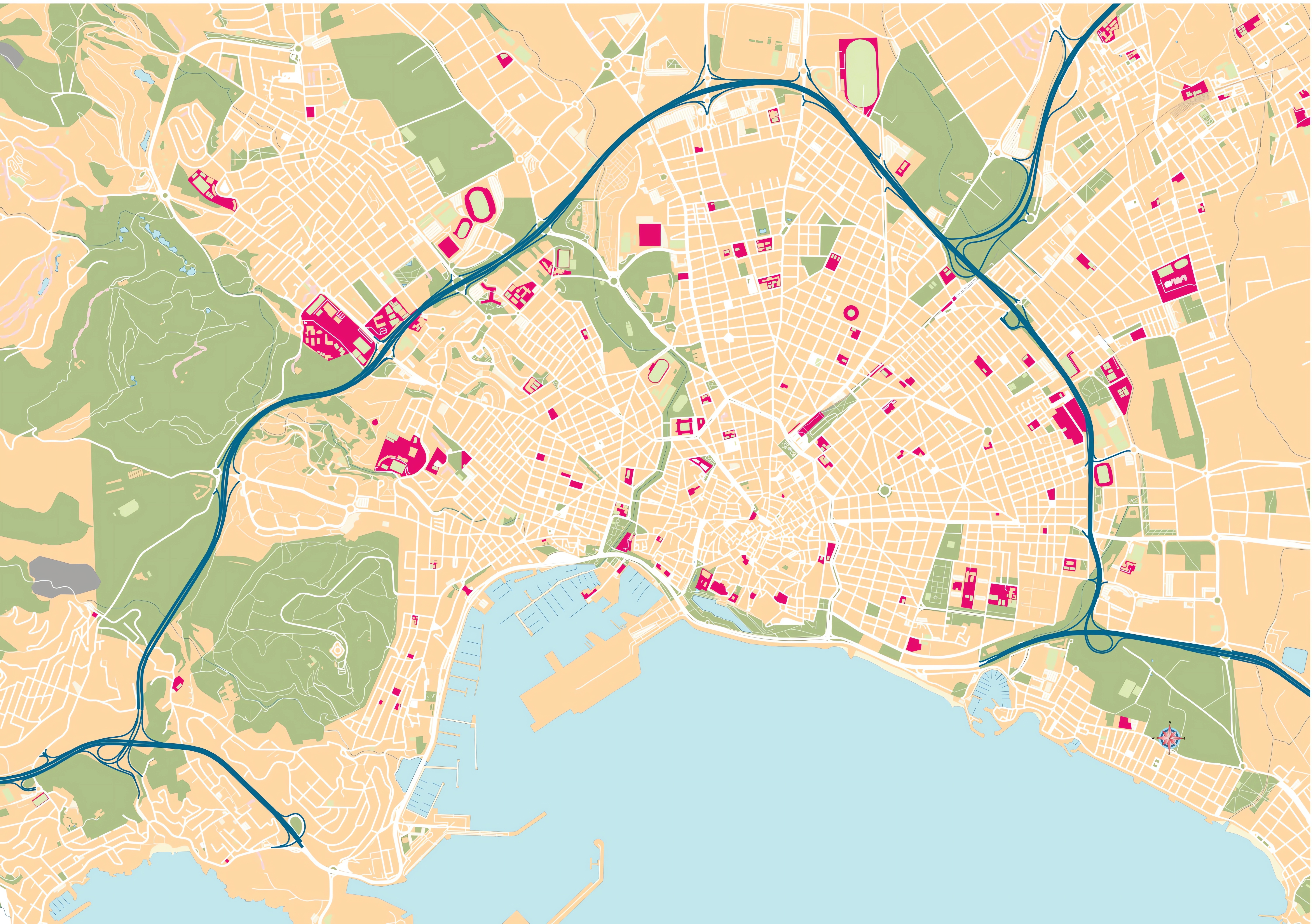 Este mapa mudo de Palma de Mallorca representa la cartografía de la ciudad, pero sin ningún tipo de etiquetado. Este mapa en blanco puede utilizarse, por ejemplo, en el ámbito educativo. Puede servir como base para muchos mapas más elaborados.