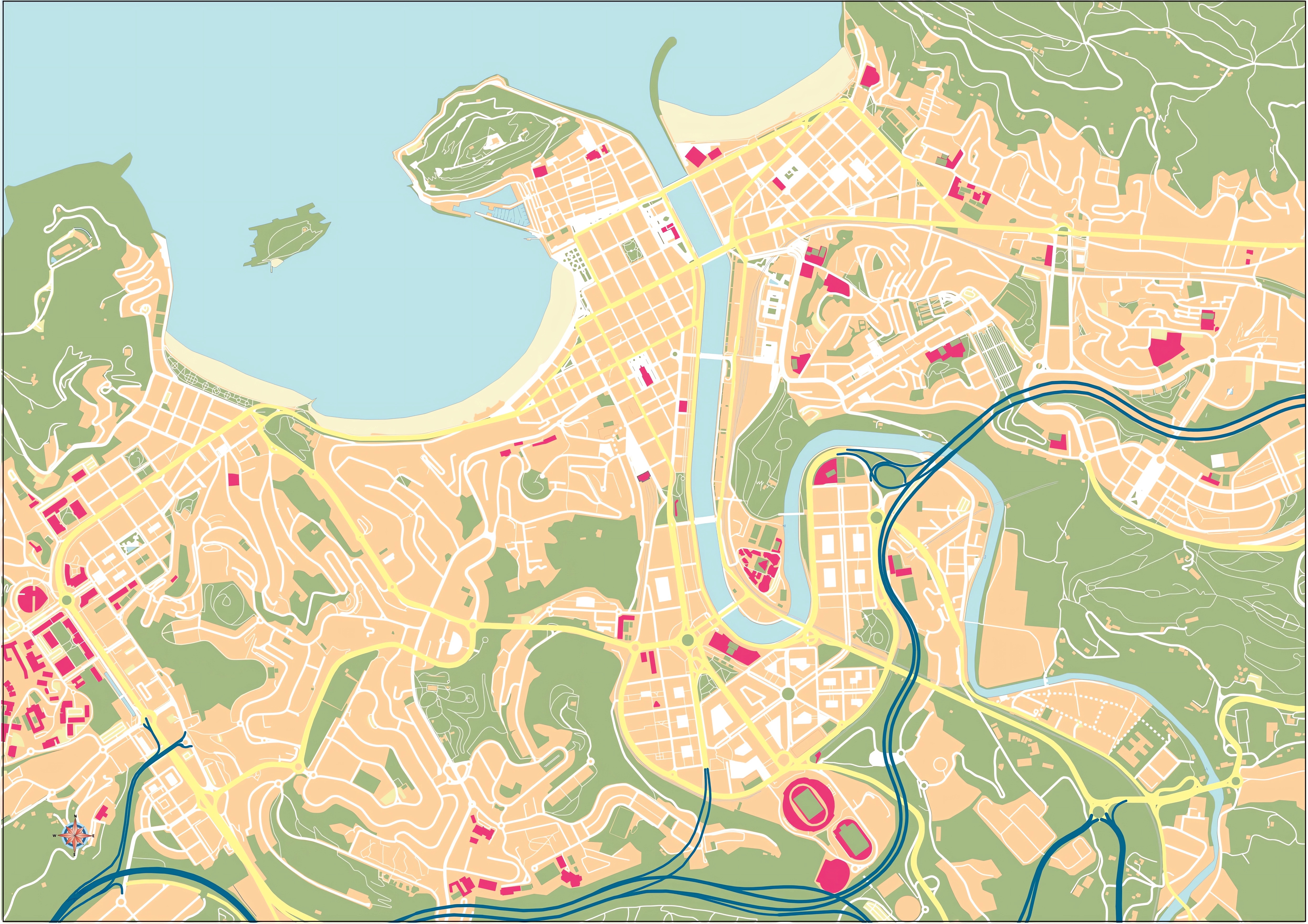 Este mapa mudo de San Sebastián representa la cartografía de la ciudad, pero sin ningún tipo de etiquetado. Este mapa en blanco puede utilizarse, por ejemplo, en el ámbito educativo. Puede servir como base para muchos mapas más elaborados.