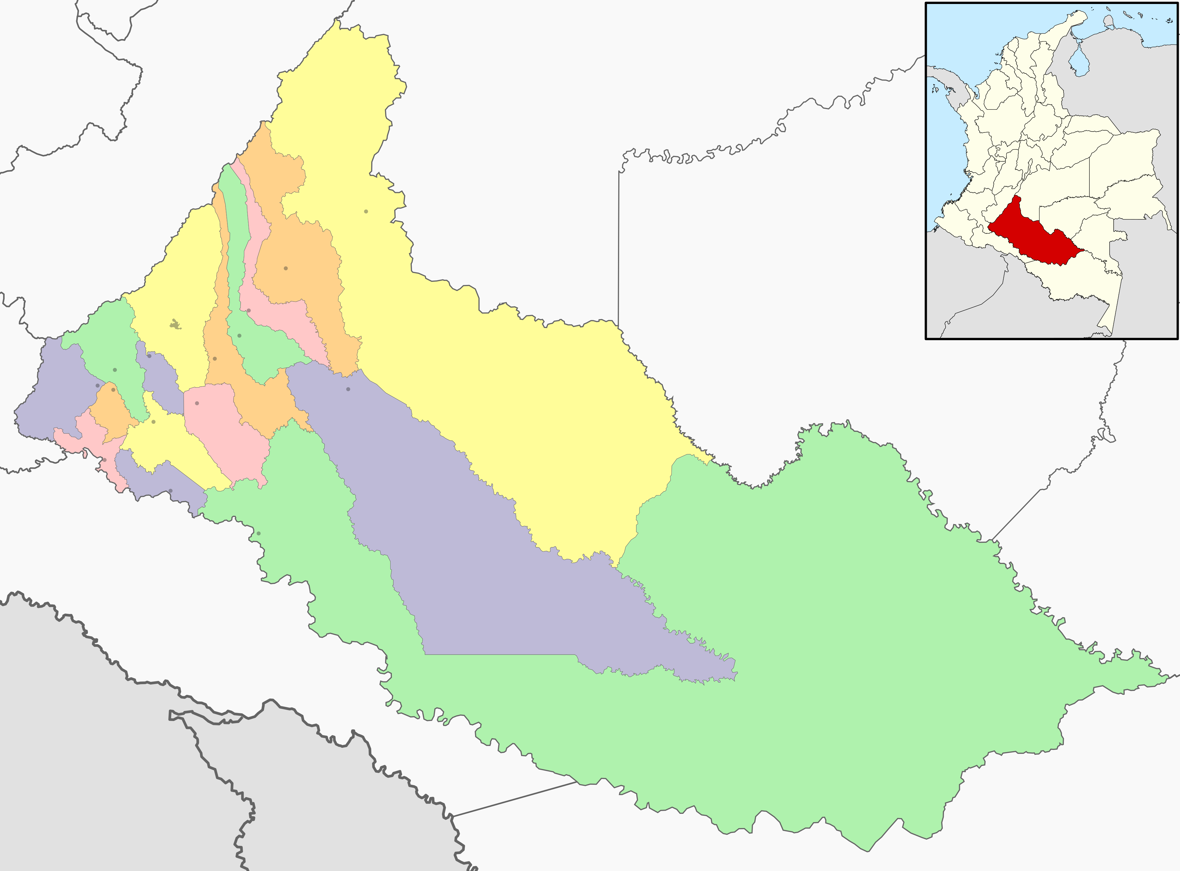 Estos mapas mudos del departamento de Caquetá representan la cartografía del departamento, pero sin ningún tipo de etiquetado. Estos mapas en blanco se pueden utilizar, por ejemplo, en el ámbito de la educación. Pueden servir como base para muchos mapas más elaborados.