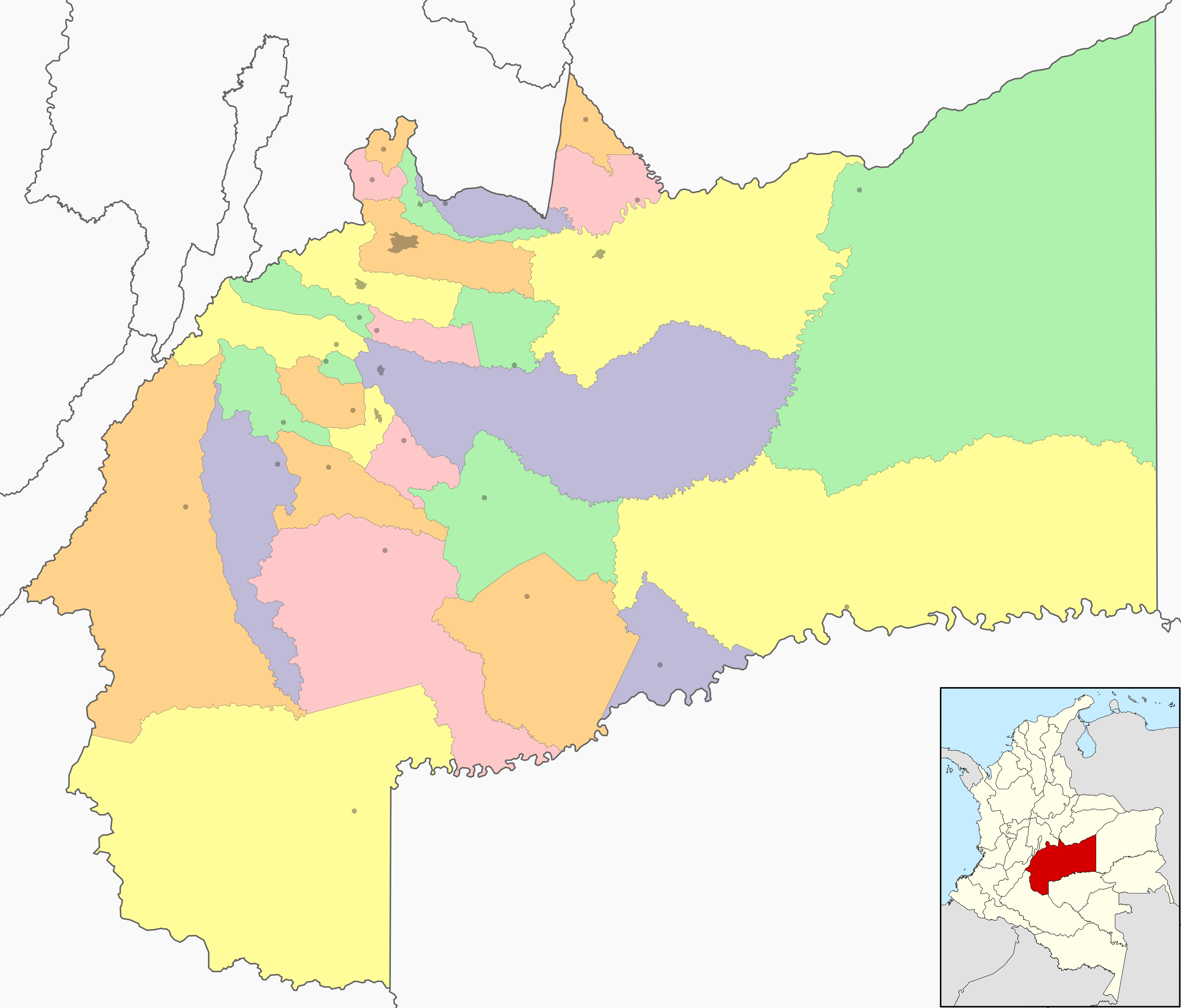Estos mapas mudos del departamento del Meta representan la cartografía del departamento, pero sin ningún tipo de etiquetado. Estos mapas en blanco se pueden utilizar, por ejemplo, en el ámbito de la educación. Pueden servir como base para muchos mapas más elaborados.