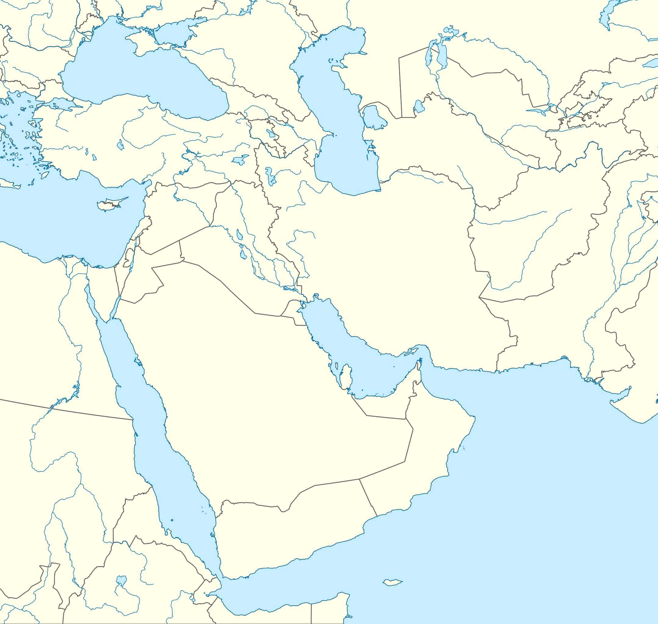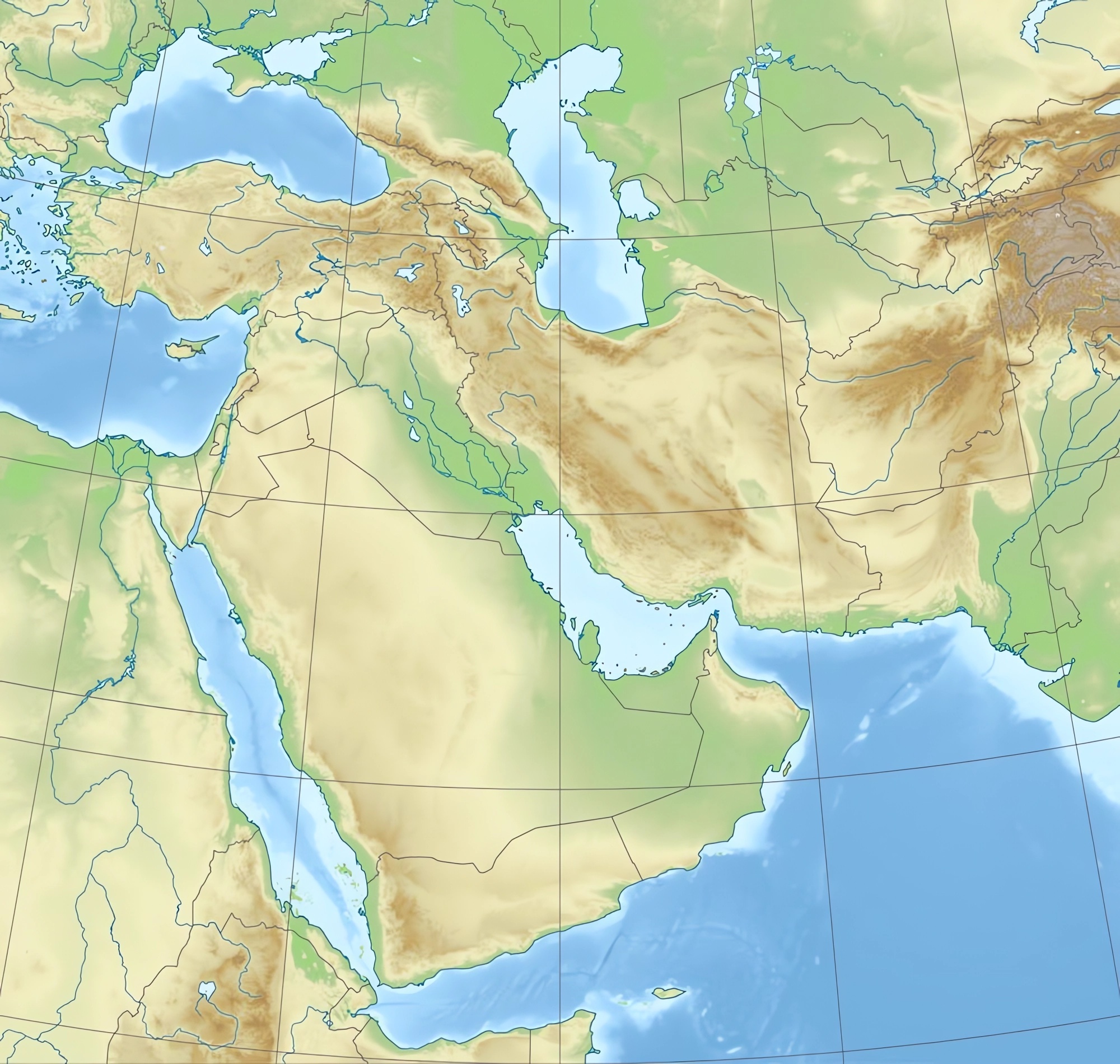 Estos mapas mudos del Medio Oriente representan la cartografía de la región, pero sin ningún tipo de etiquetado. Estos mapas en blanco se pueden utilizar, por ejemplo, en el ámbito de la educación. Pueden servir como base para muchos mapas más elaborados.