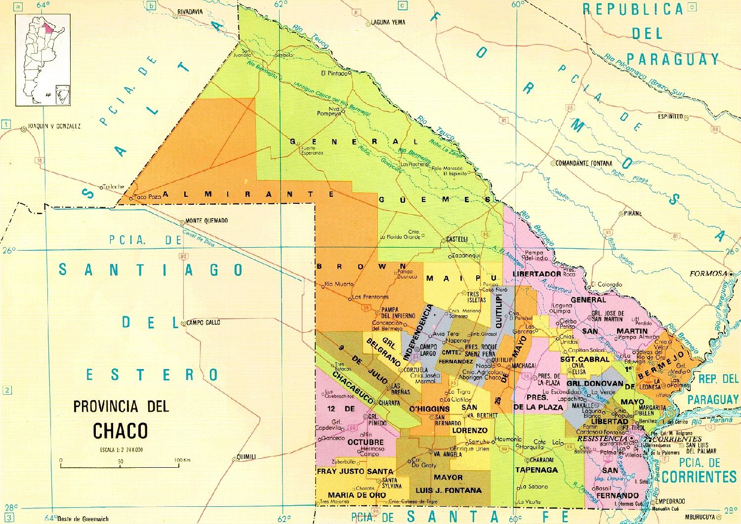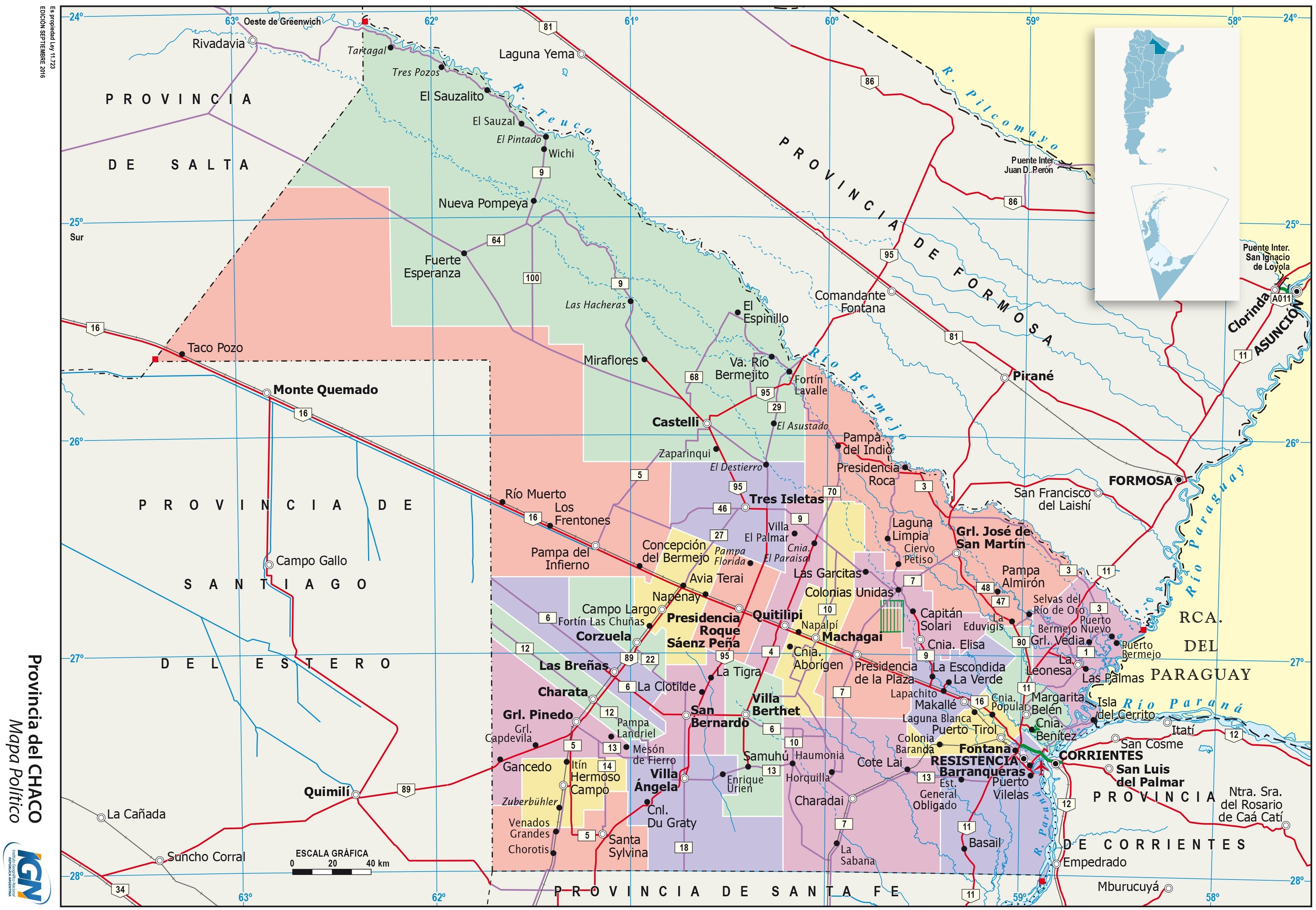 La Provincia del Chaco se divide políticamente en 25 departamentos, que constituyen sus principales unidades administrativas. Dentro de ellos se organizan municipios y comisiones municipales. Su capital y ciudad más poblada es Resistencia.