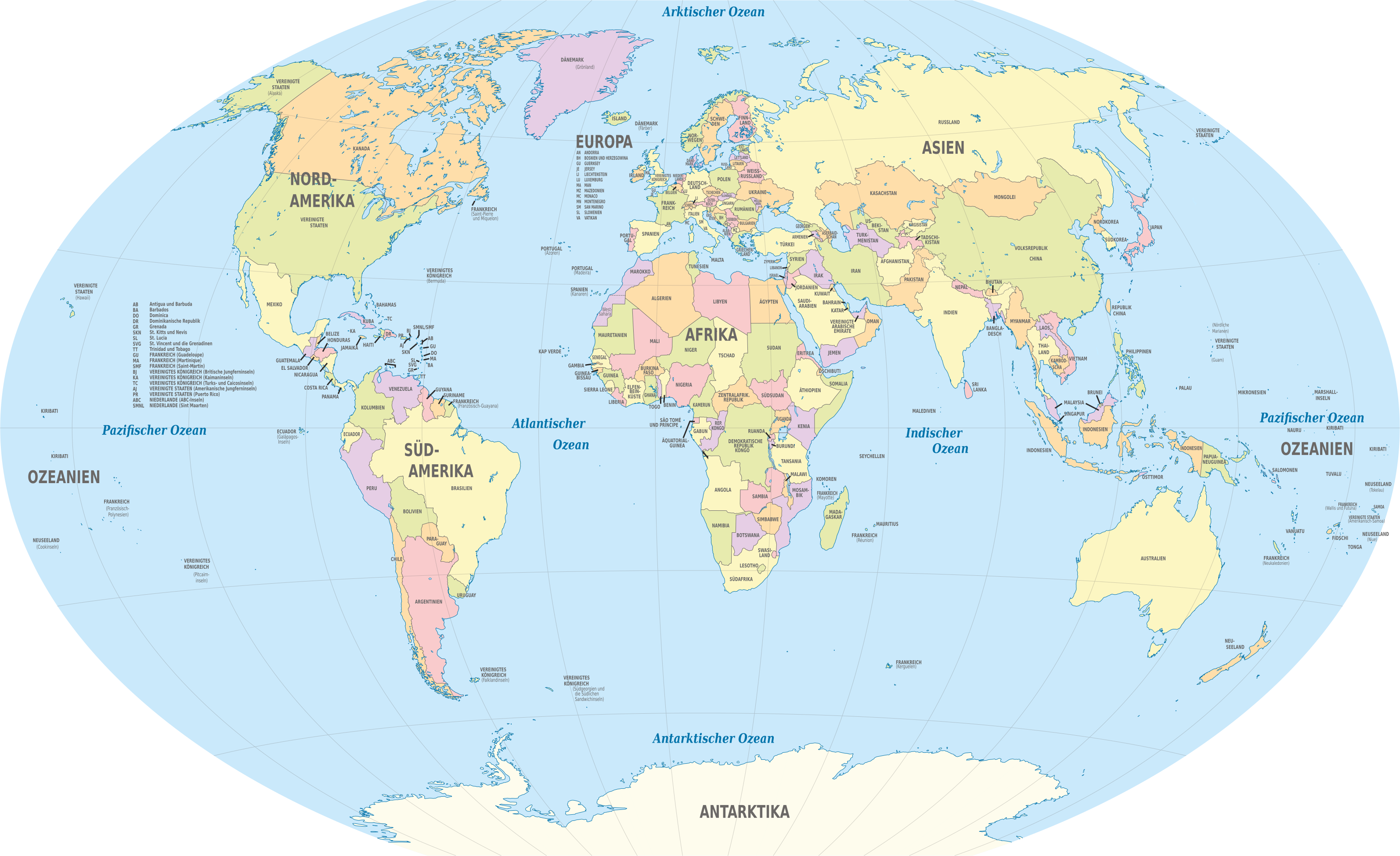 Mapa político mundial que representa la superficie de la Tierra, centrándose en las divisiones creadas por el hombre en lugar de en las características naturales.