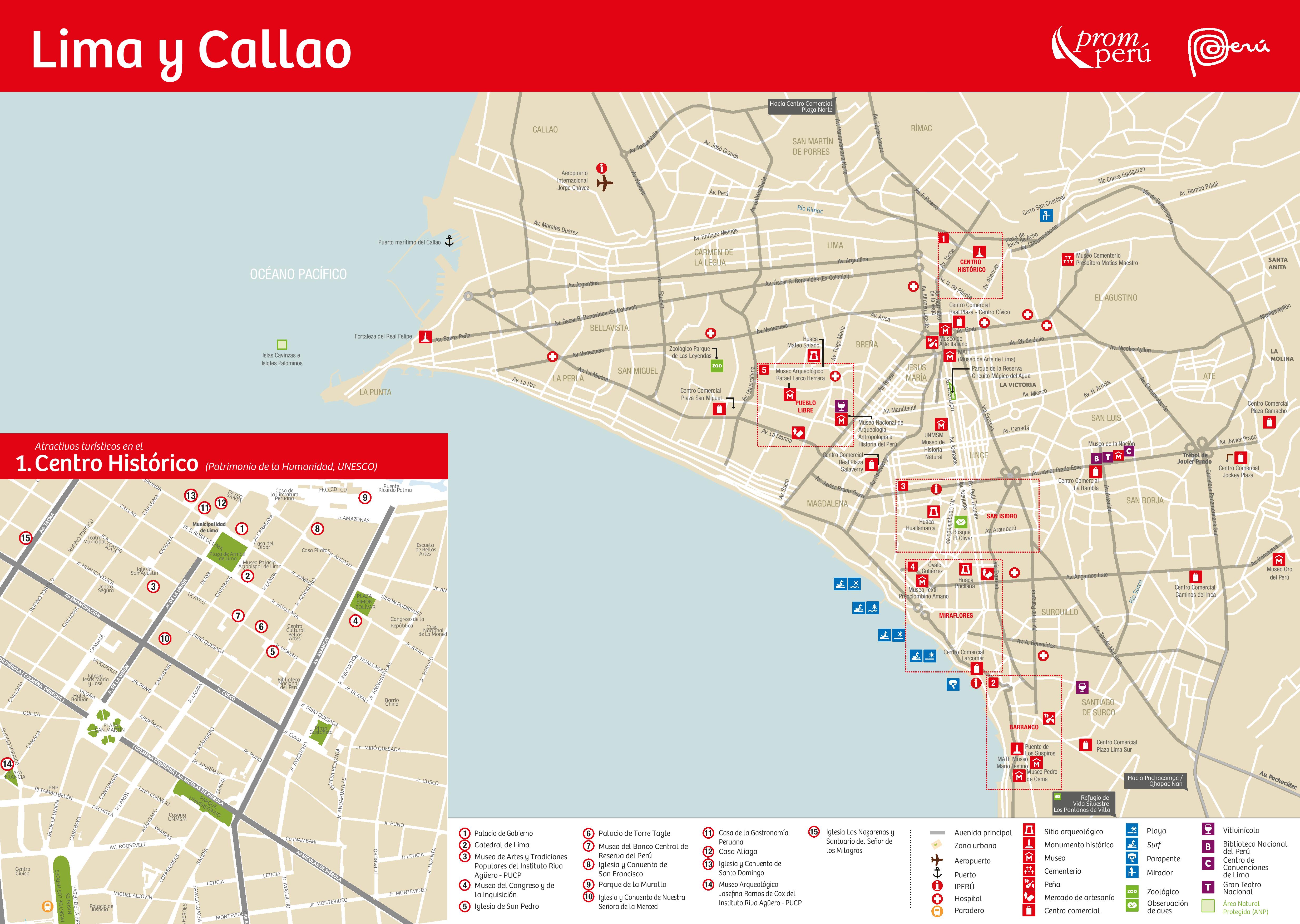 El centro histórico de Lima, el cual comprende parte de los distritos de Lima y Rímac, fue declarado Patrimonio de la Humanidad por la Unesco en 1988 debido a la importancia que tuvo la ciudad durante el Virreinato del Perú, dejando como testimonio una gran cantidad de legados arquitectónicos. Destacan la Basílica y Convento de San Francisco, la Plaza Mayor, la Catedral de Lima, la Basílica y Convento de Santo Domingo, el Palacio de Torre Tagle, entre otros. El recorrido por las iglesias de la ciudad es muy popular entre los turistas. En un corto recorrido por el centro de la ciudad podemos encontrar muchas, varias de las cuales datan de los siglos XVI y XVII.