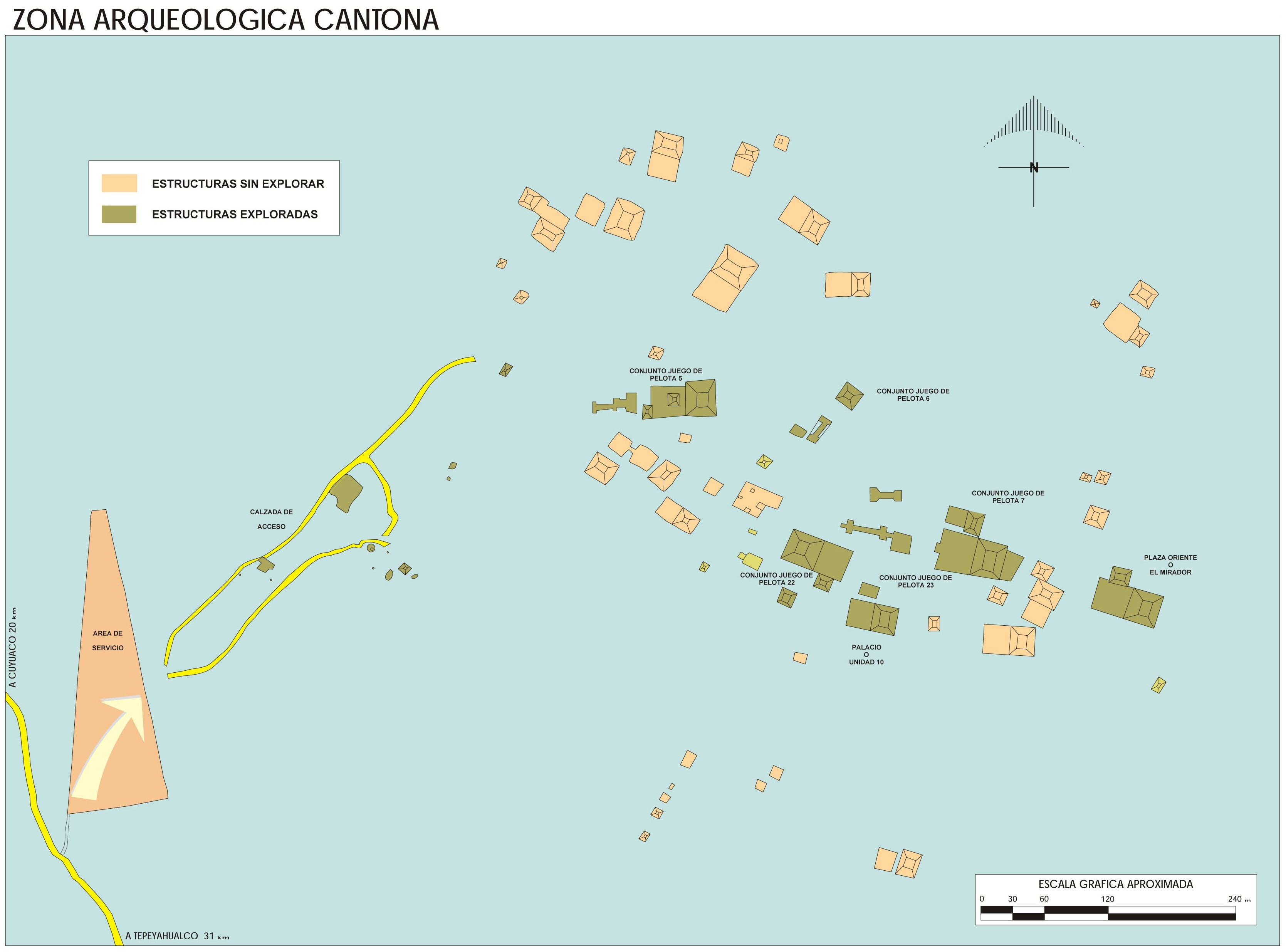 Cantona: Ciudad prehispánica fortificada, con más de 24 canchas de juego de pelota y 3,000 patios residenciales.