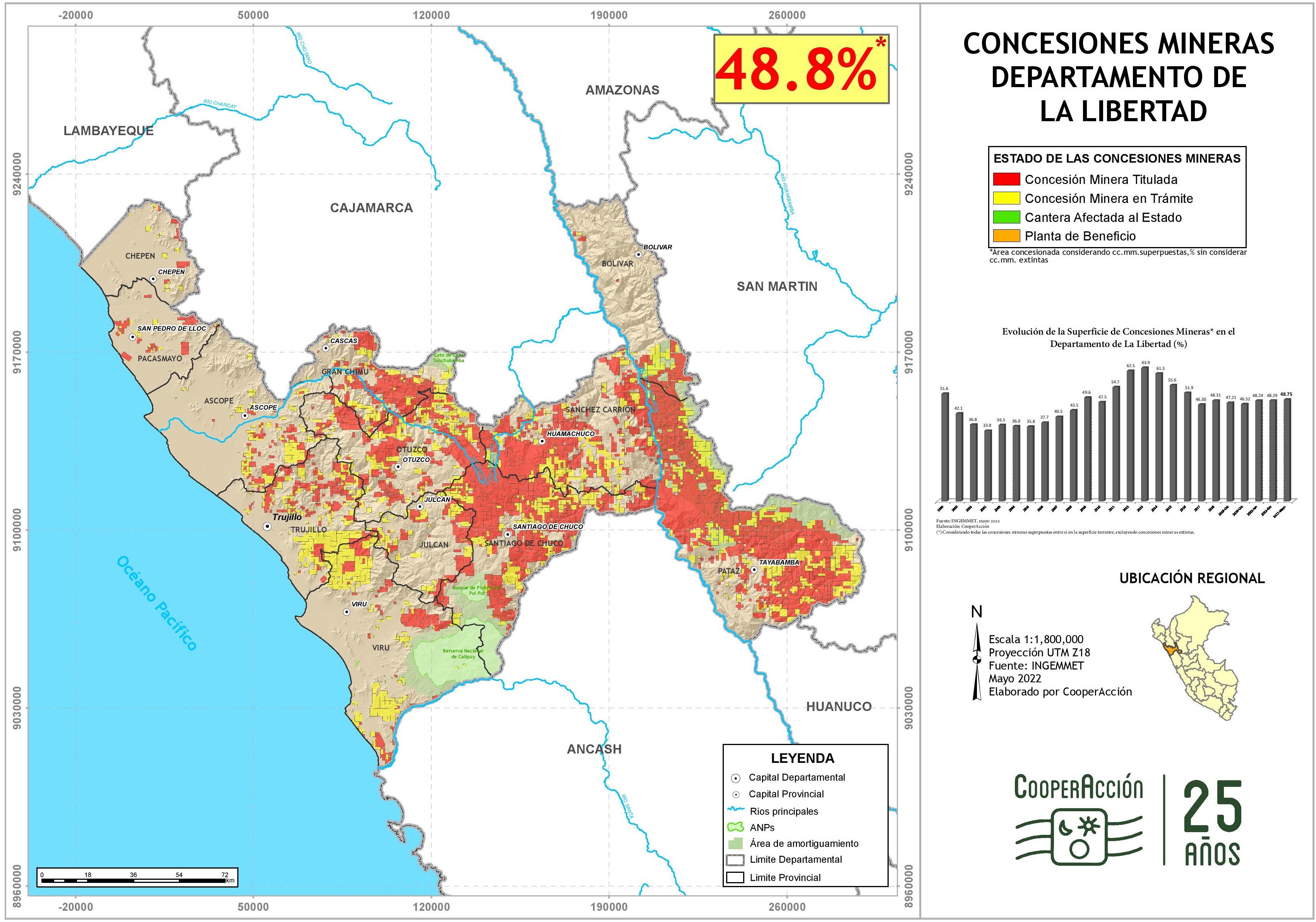 Según cifras del Ministerio de Energía y Minas, las reservas probadas y probables de oro en el país sumaron 64,9 miles de onzas finas en el año 2019, lo que convierte a La Libertad el segundo departamento con más reservas de este mineral (9,7 millones de onzas finas), después de Cajamarca (30,7 millones de onzas).
