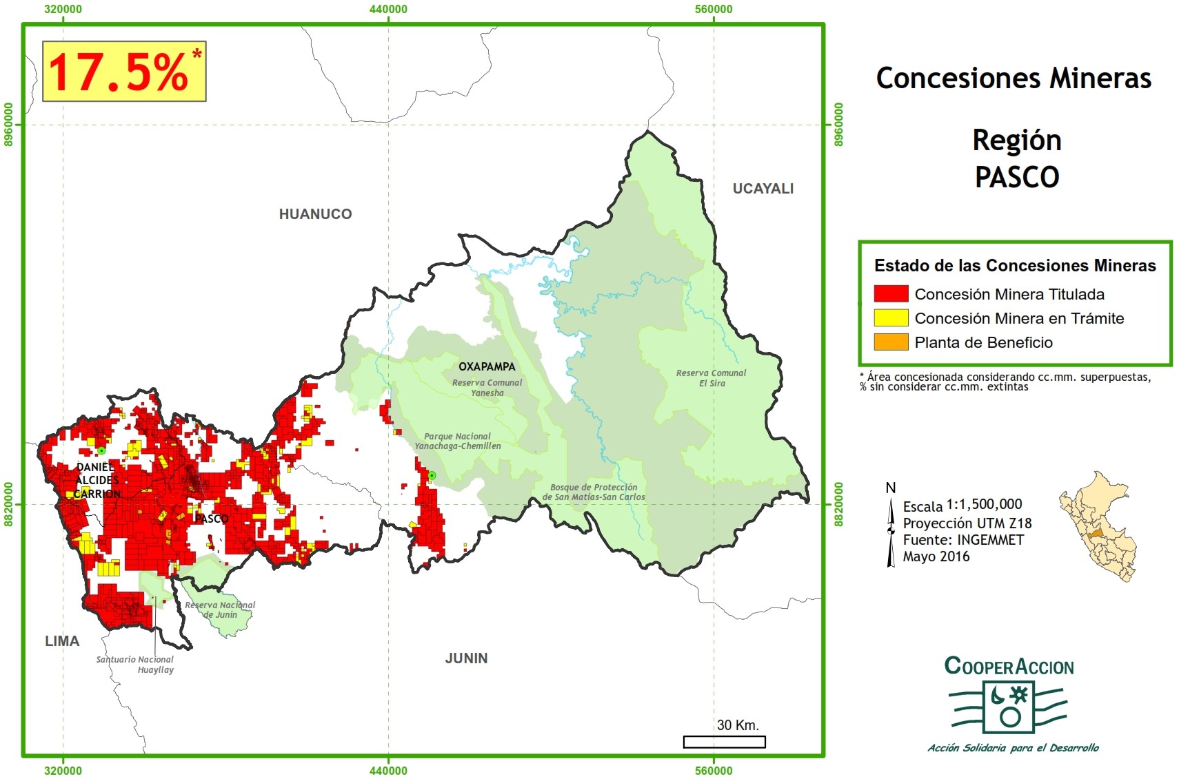 Durante 2020, del aporte minero nacional de S/ 4,3 mil millones (canon minero, regalías mineras y derechos de vigencia), Pasco contribuyó con S/ 58,5 millones (1,3 por ciento de participación), el mismo que disminuyó en 43,0 por ciento respecto de 2019. En el departamento, la principal contribución en 2020 se concentró en canon minero (S/ 28,3 millones), seguido de regalías mineras (S/ 20,4 millones).