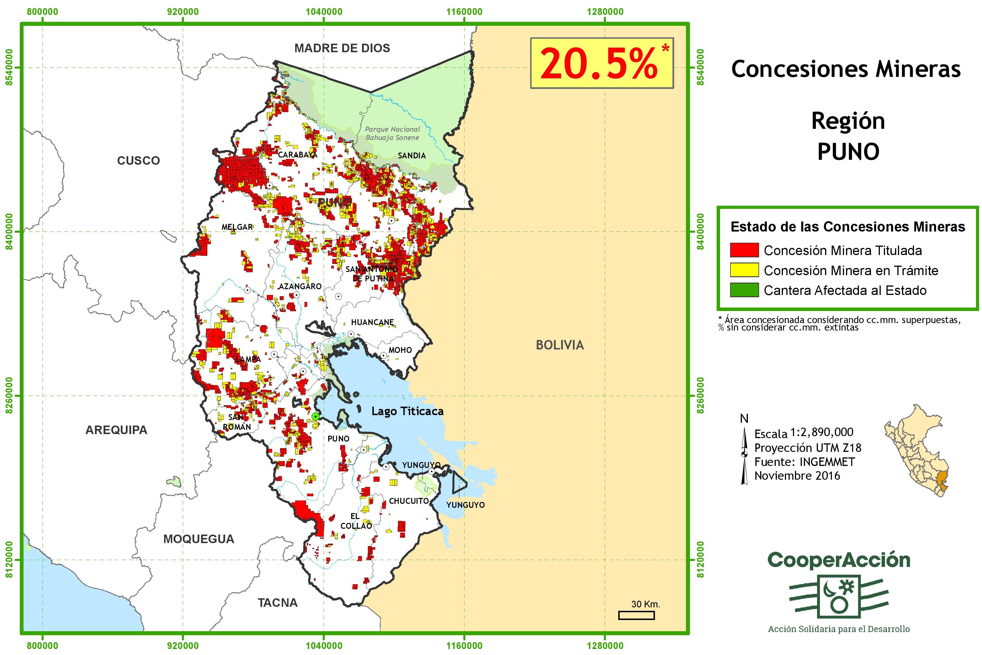 Según la información brindada por el BCR, el departamento de Puno cuenta con reservas de plata que constituyen el 5% de las reservas nacionales; en cobre posee el 0,5% y en estaño el 10%, siendo importantes también las reservas de uranio en la provincia de Macusani, actualmente en proceso de exploración. A nivel nacional, Puno es el único productor de estaño con una producción 18,789 toneladas métricas finas que representa el 100% nacional , noveno productor de oro y décimo quinto en la producción de plata. Según el Instituto Peruano de Energía Nuclear – IPEN, son cinco los principales prospectos evaluados en Corani – Carabaya, con recursos asegurados de uranio que asciende a 10,808.80 TM, establecidos en 500 has