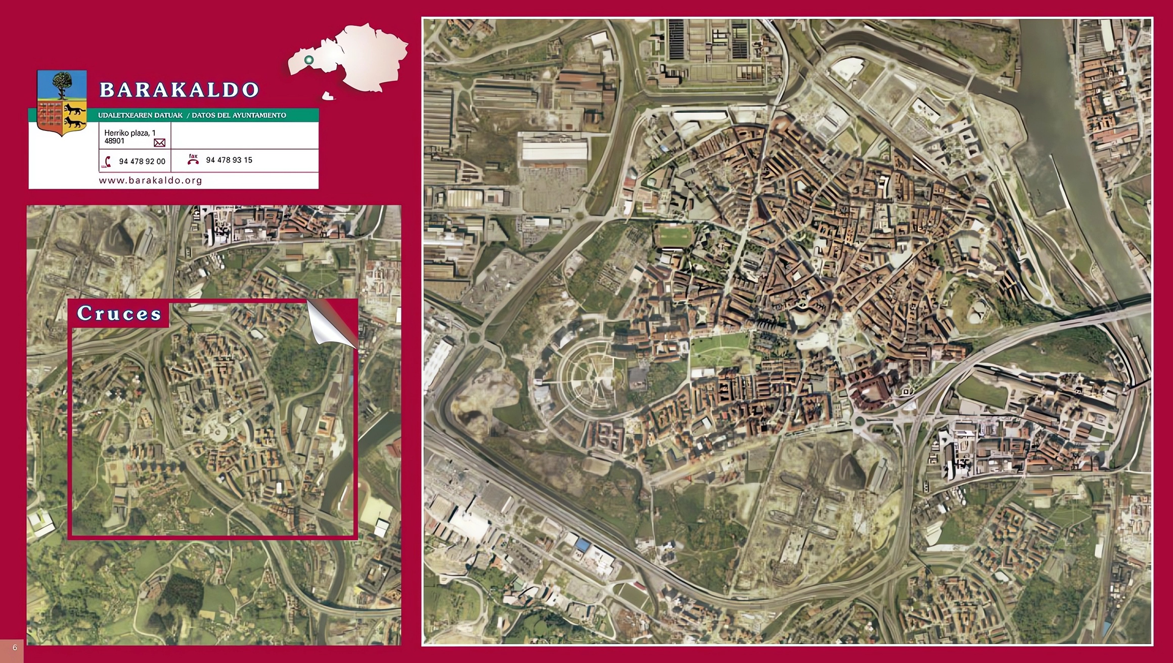 Ortofoto de Baracaldo: imagen ortorectificada del municipio, lo que significa que se ha ajustada para eliminar las distorsiones debidas a la perspectiva, la inclinación de la cámara y la orografía. Esto permite que cada punto de la imagen tenga una posición correcta en un sistema de coordenadas, similar a la representación de un mapa.