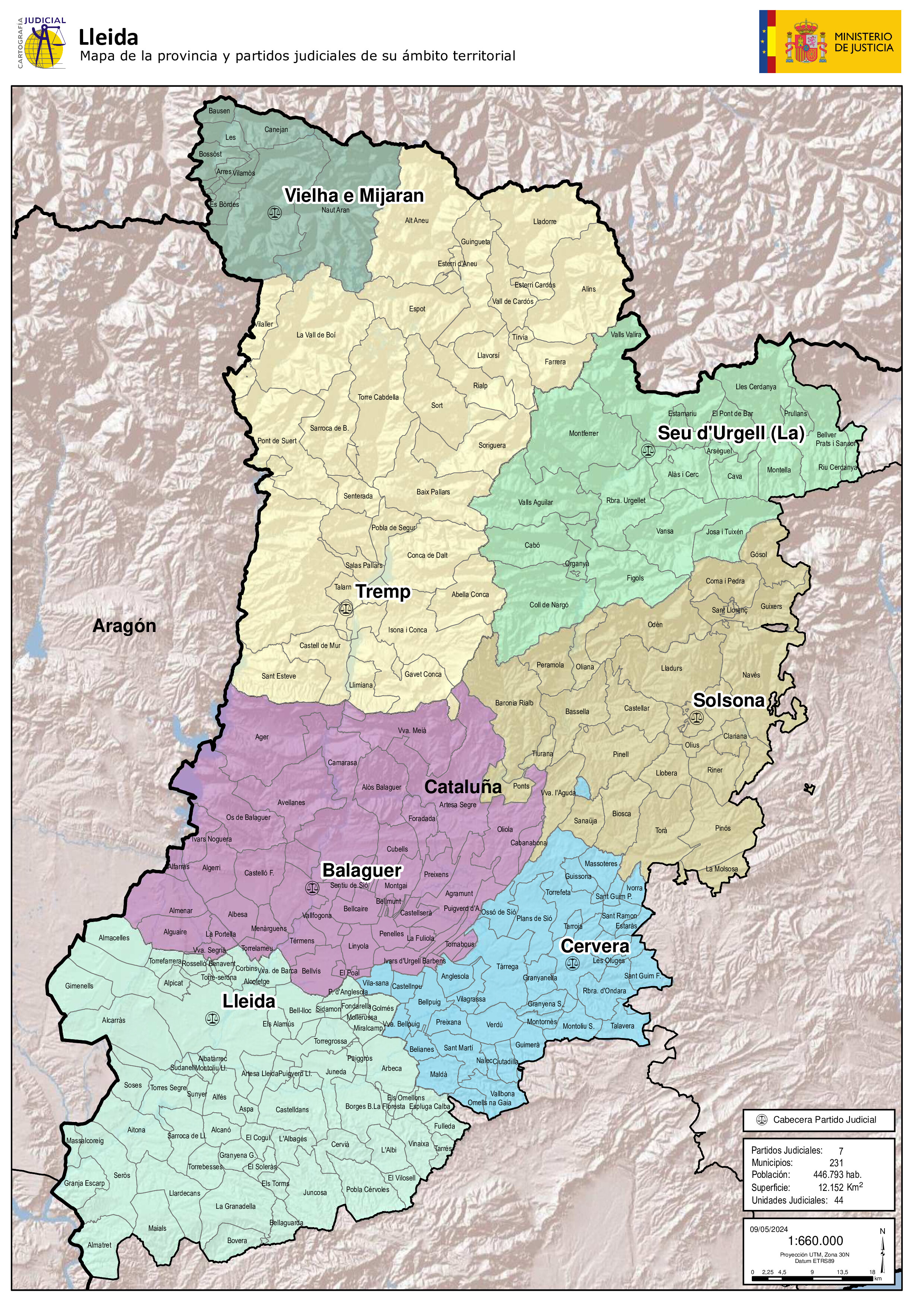 En virtud de dicha ley, los municipios de la provincia de Lérida se distribuyen en los partidos judiciales que se indican en el siguiente listado: