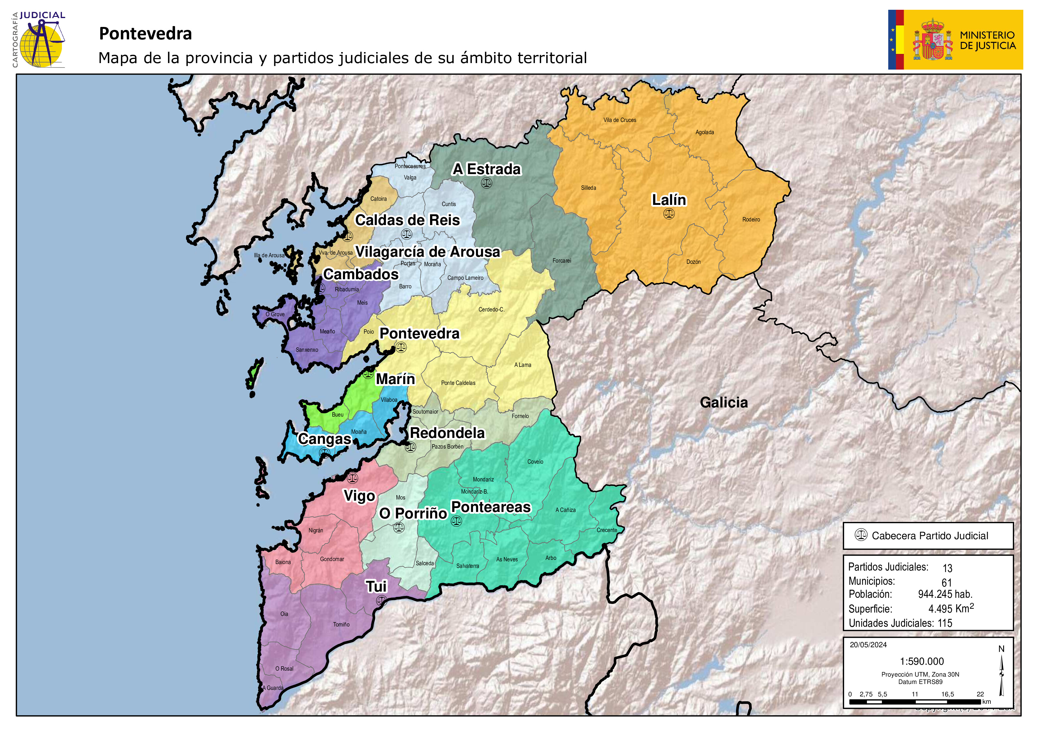 En virtud de dicha ley, los municipios de la provincia de Pontevedra se distribuyen en los partidos judiciales que se indican en el siguiente listado: