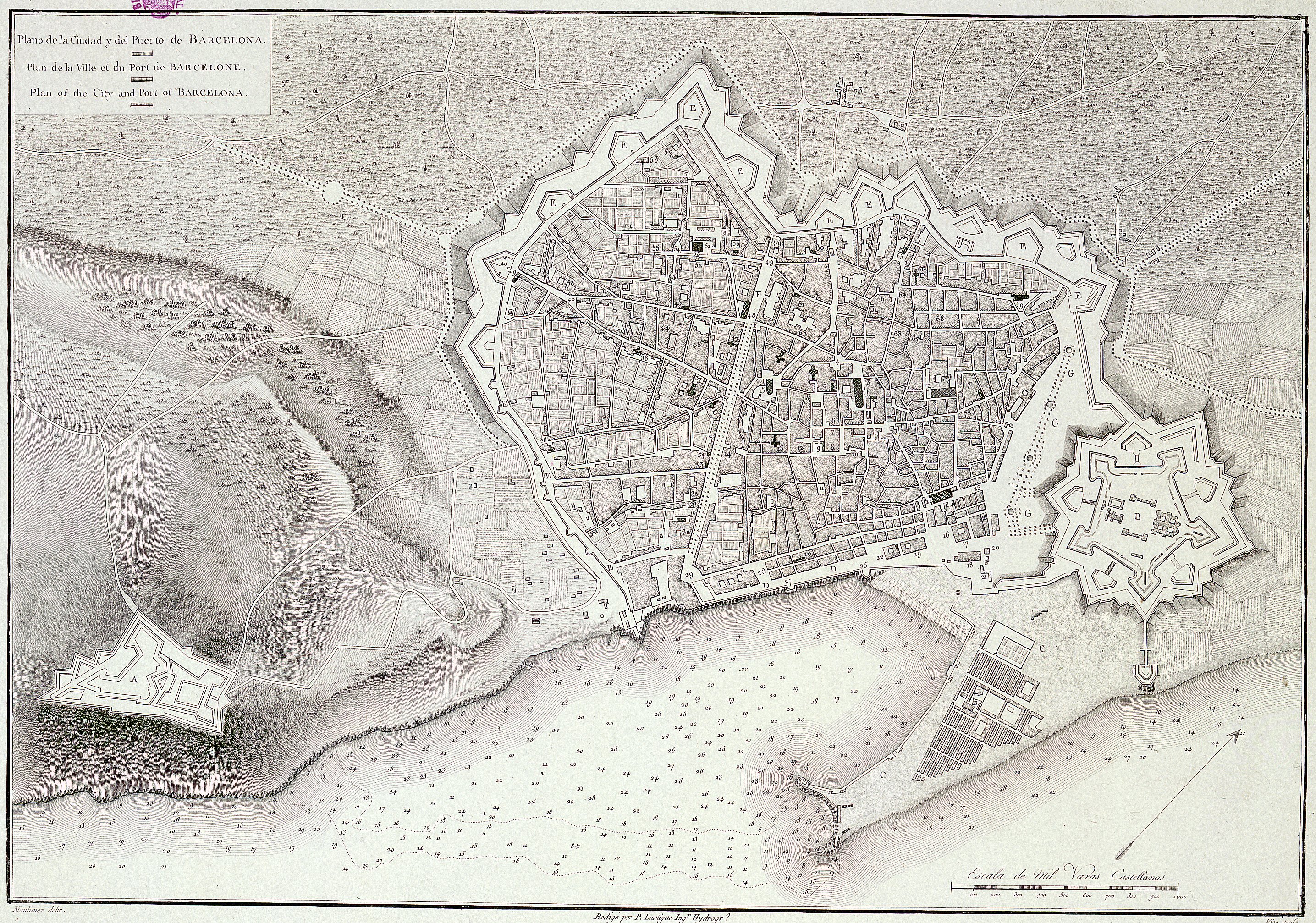Plano de Barcelona (circa 1806) (formato PDF) que muestra la ciudad en el centro, flanqueada por la Ciudadela a la derecha y el Castillo de Montjuïc a la izquierda. Publicado en Voyage pittoresque et historique de l’Espagne por Alexandre de Laborde. París, 1806-1820.