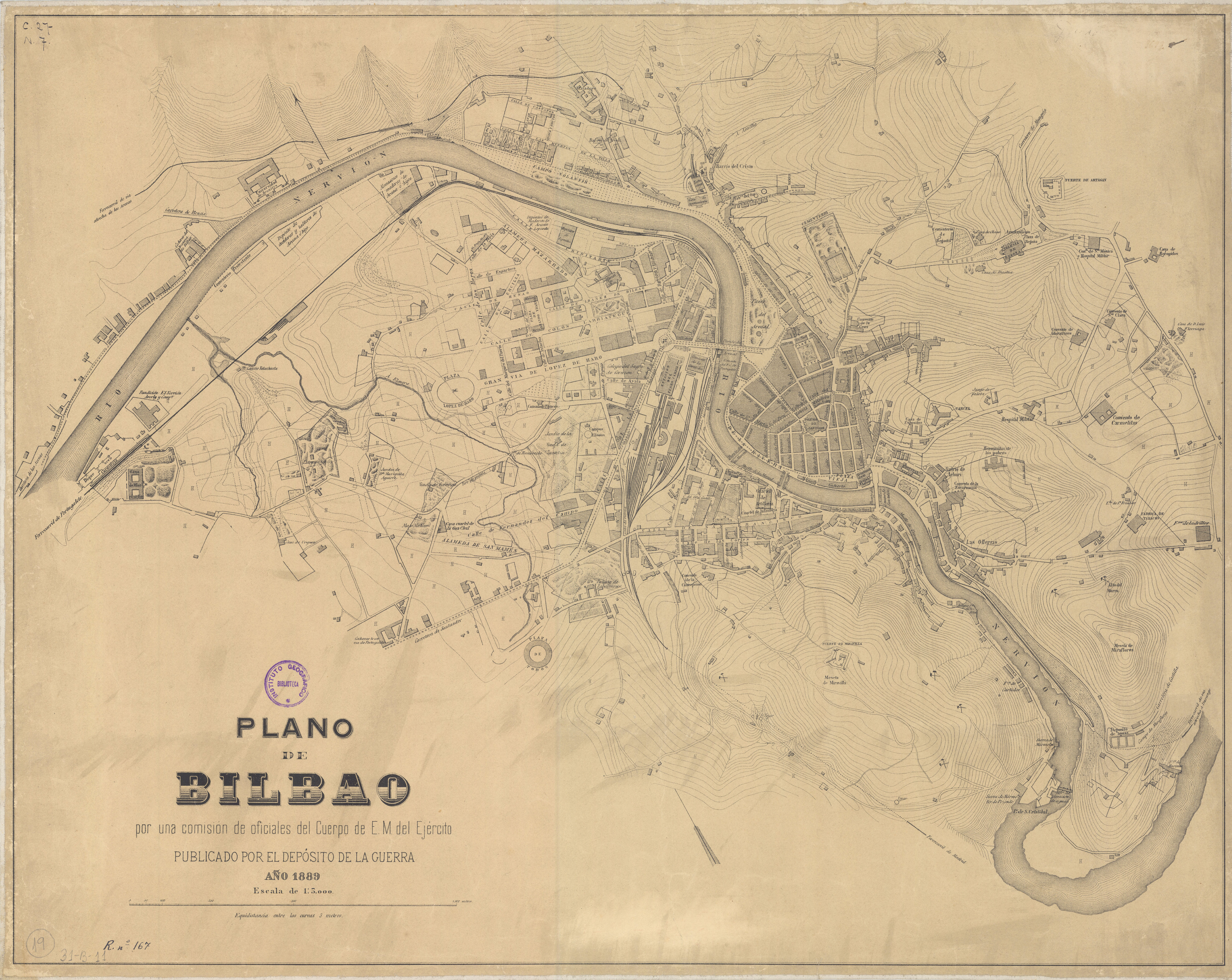 Comprende el plano de la ciudad de Bilbao. Pertenece al Depósito de Guerra creado por Decreto de 9 de junio de 1810, encargado de reunir los documentos históricos, geográficos y topográficos que los Jefes de Estado Mayor remitiesen al Estado Mayor General. Marco sin graduar. En el ángulo inferior izquierdo, figuran el título del plano, autor, edición y fecha de edición. Debajo la escala gráfica y la equidistancia entre las curvas de nivel. Una flecha indica el N. Relieve representado por curvas de nivel con equidistancia de tres metros. Planimetría con bloques de manzanas con rayado fino, calles, plazas, edificios aislados, minas, red de comunicaciones, puentes e iniciales indicando uso del suelo. La hidrografía representa el río Nervión con dibujo de aguas. Toponimia urbana. Rotulación en letra romanilla, itálica y de palo. Datado durante la Regencia de María Cristina de Habsburgo (1885-1902).