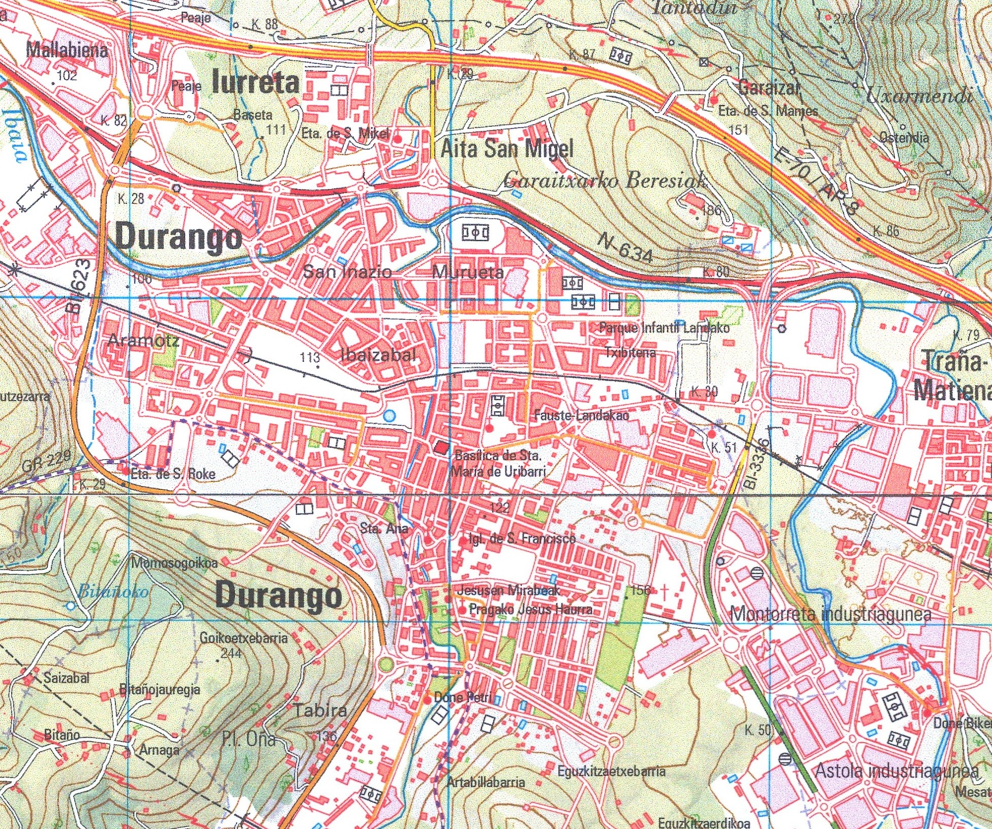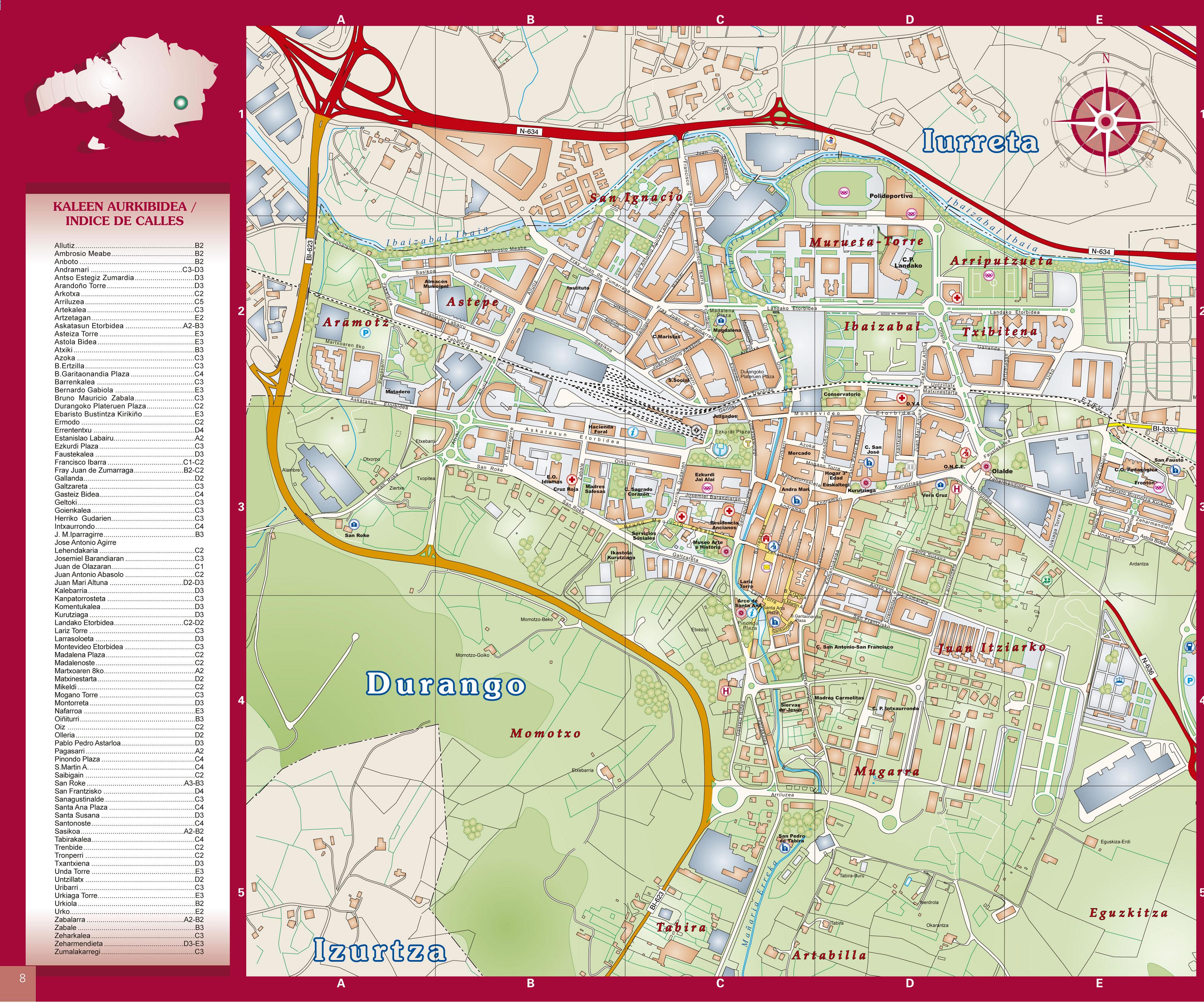 Durango tiene 29 887 habitantes (2024). Tres ríos atraviesan el municipio (como se ilustra en el símbolo del municipio). El río Ibaizabal es el principal y se encuentra en medio de su amplio valle, con la sierra de Urkiola y el parque natural al sur.