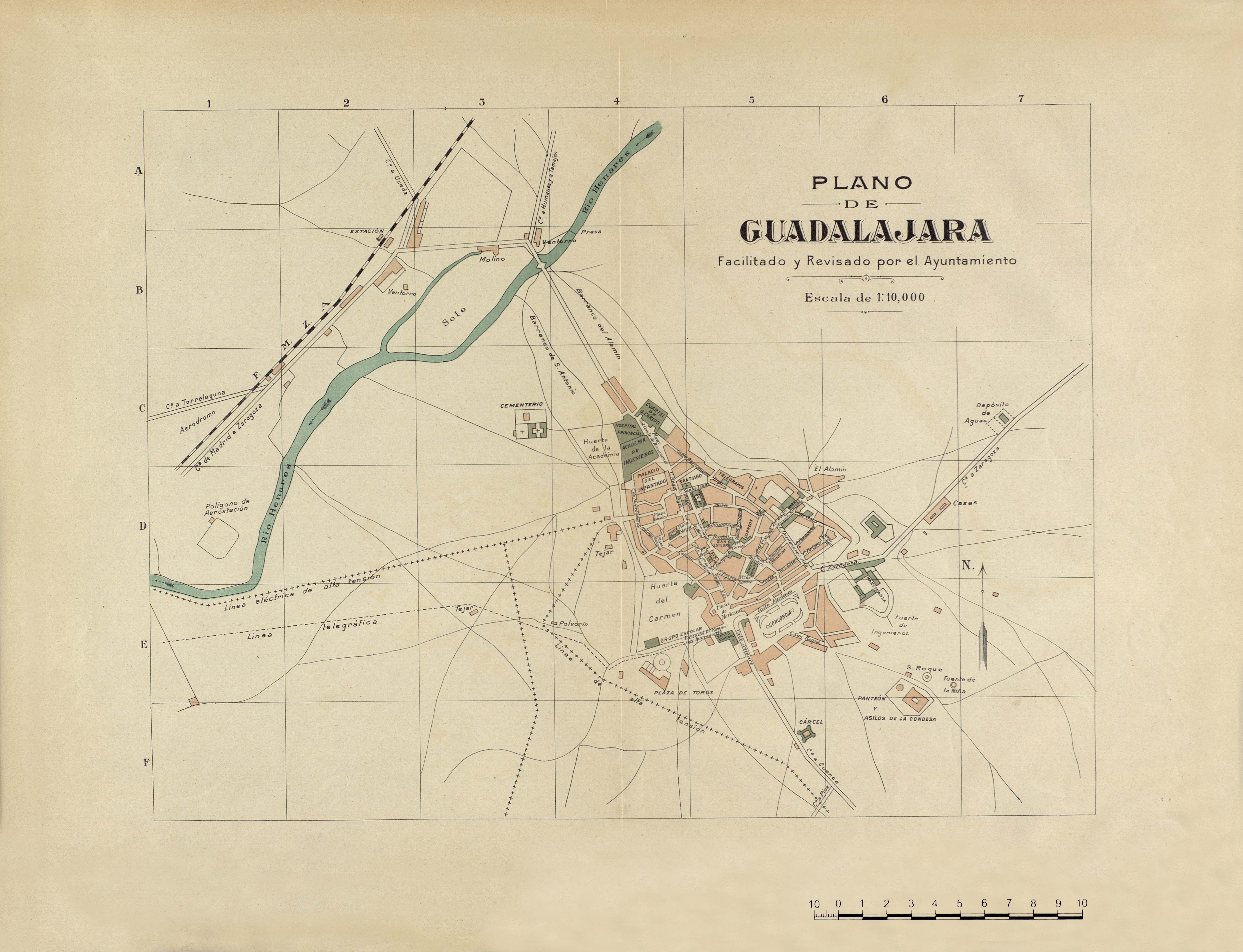 Plano de Guadalajara (España). Cromolitografía hacia 1910. facilitado y revisado por el Ayuntamiento. Publicado en Barcelona. Editor A. Martin. Muestra las vías y edificios públicos así como la posición. Escala original, 1:10.000.