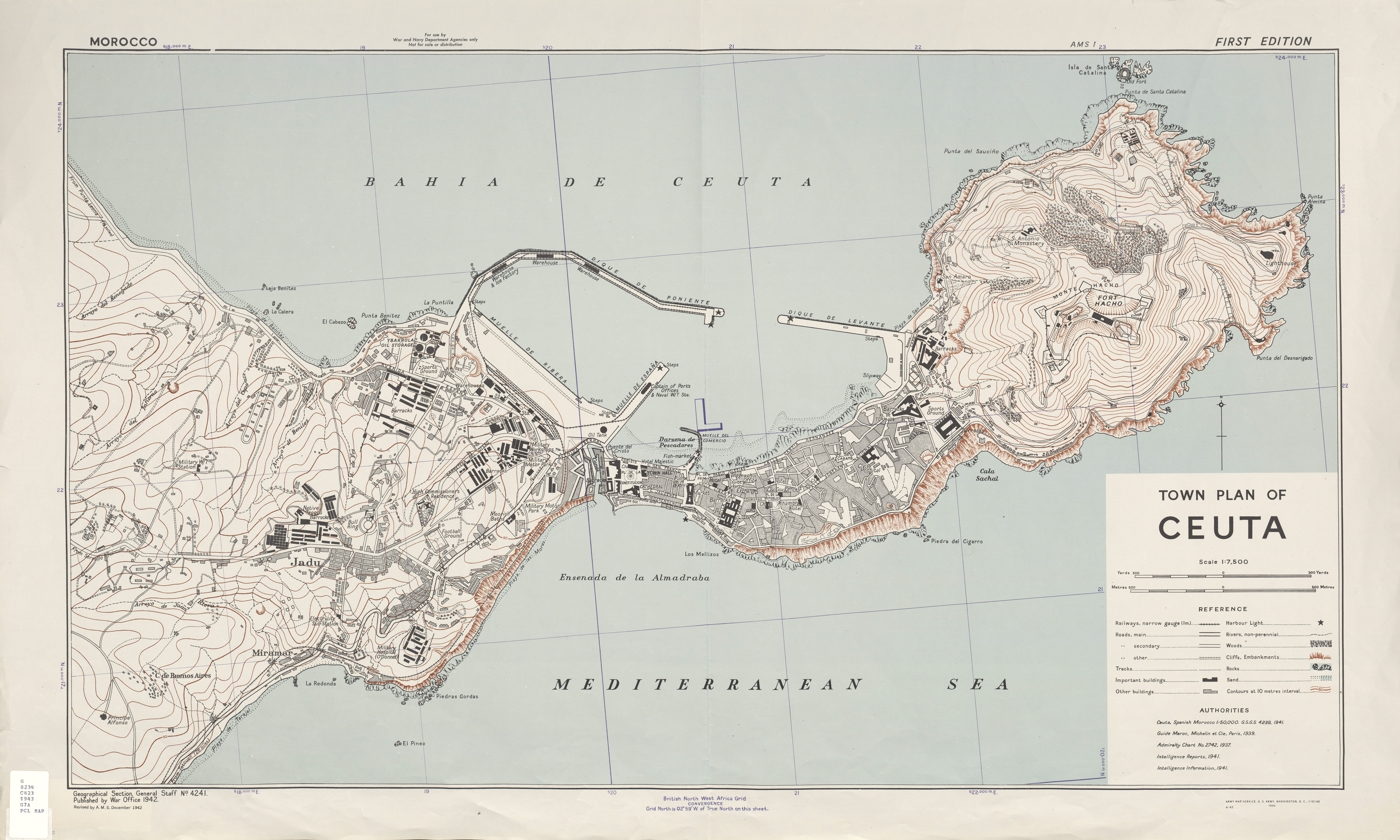 Plano de la ciudad de Ceuta 1942, preparado por la Sección Geográfica del Estado Mayor, número 4241, Ministerio de Guerra en 1942, primera edición del Servicio Cartográfico del Ejército de los EE. UU., Washington, D.C. 110140. Referencias: Ceuta, Marruecos español 1: 50 0000. G.S.G.S. 4239, 1941; Guide Maroc Michelin et Cie, Paris, 1939; Mapa del Almirantazgo no. 2742, 1937; Informes de inteligencia de 1941; Información de inteligencia 1941.