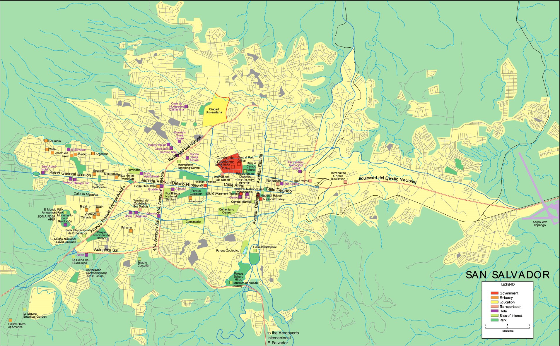 - Cercana al Aeropuerto Internacional de El Salvador (Comalapa), ubicado fuera de la ciudad.
