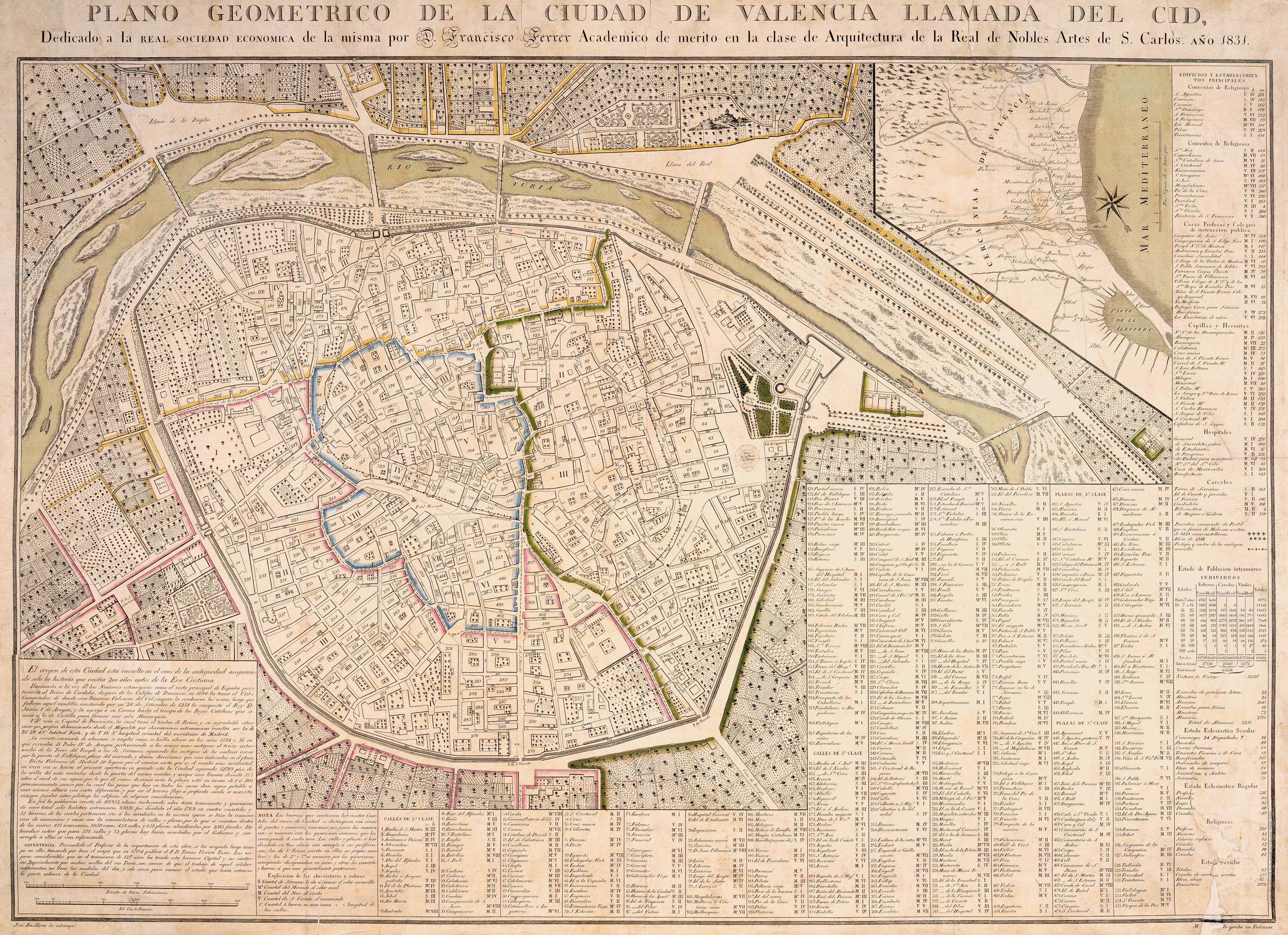 Plano geométrico de la ciudad de Valencia (formato PDF) llamada del Cid, dedicado a la Real Sociedad Económica de la misma por D. Francisco Ferrer Académico de merito en la clase de Arquitectura de la Real de Nobles Artes de S. Carlos Año 1831.