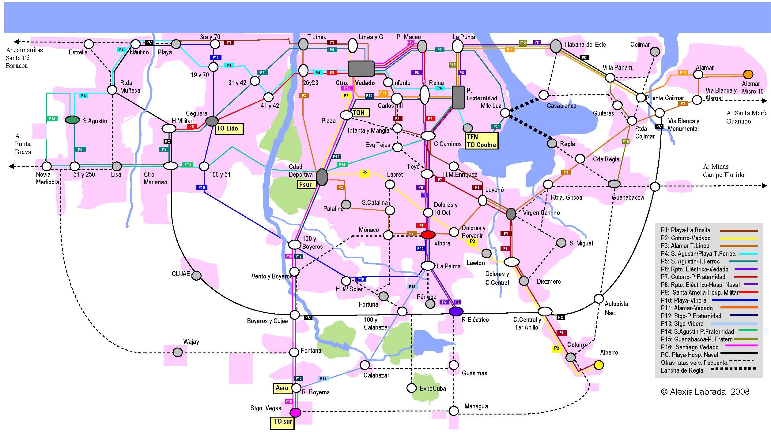 Las principales rutas de autobús en La Habana son las líneas P, que conectan los municipios de la capital y forman la columna vertebral del transporte público urbano.
