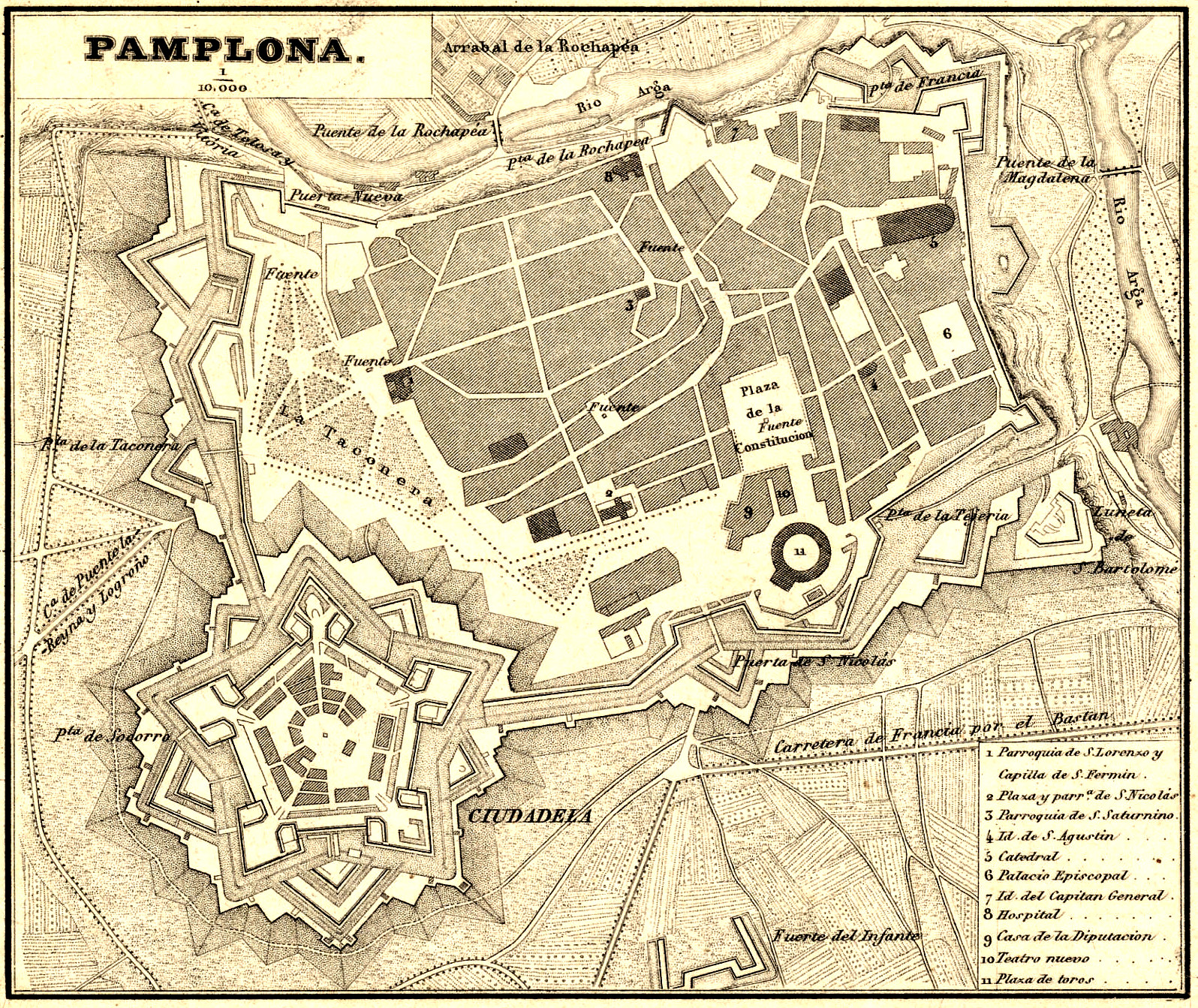 Plano de Pamplona (formato PDF) extraído del Mapa de Navarra (1861) elaborado por el Coronel, Teniente-Coronel de Ingenieros D. Francisco Coello ; Auxiliado por D. Pascual Madoz Autor de las notas Estadisticas é Históricas ; Grabado en Madrid bajo la dirección del autor.