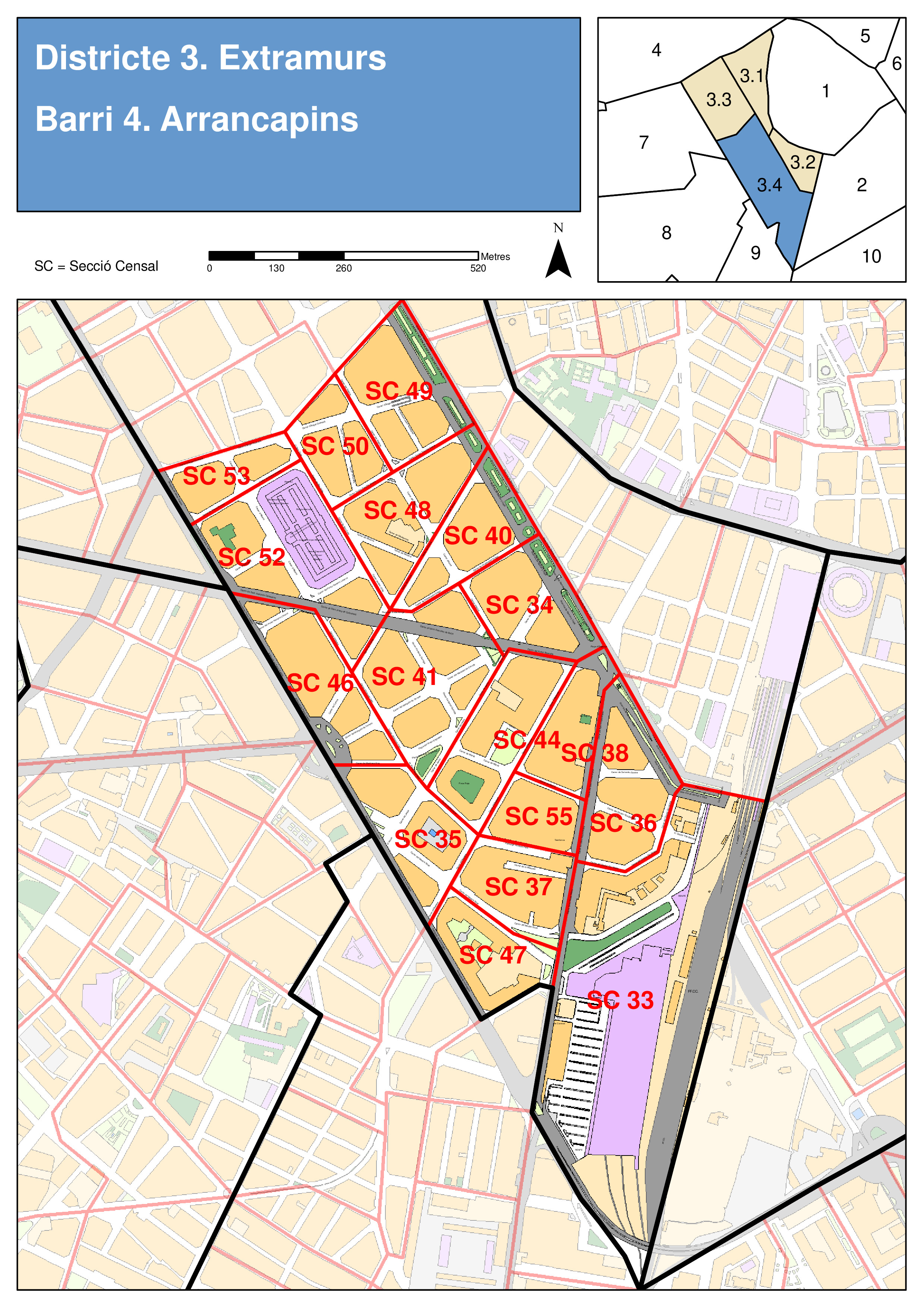 El Barrio de Arrancapins es uno de los barrios más amplios y poblados del distrito de Extramurs en Valencia. Se trata de una zona residencial, céntrica y muy bien comunicada, que conserva un ambiente tradicional y tranquilo, aunque con una creciente renovación urbana en los últimos años. Su población en 2022 era de 22.491 habitantes.