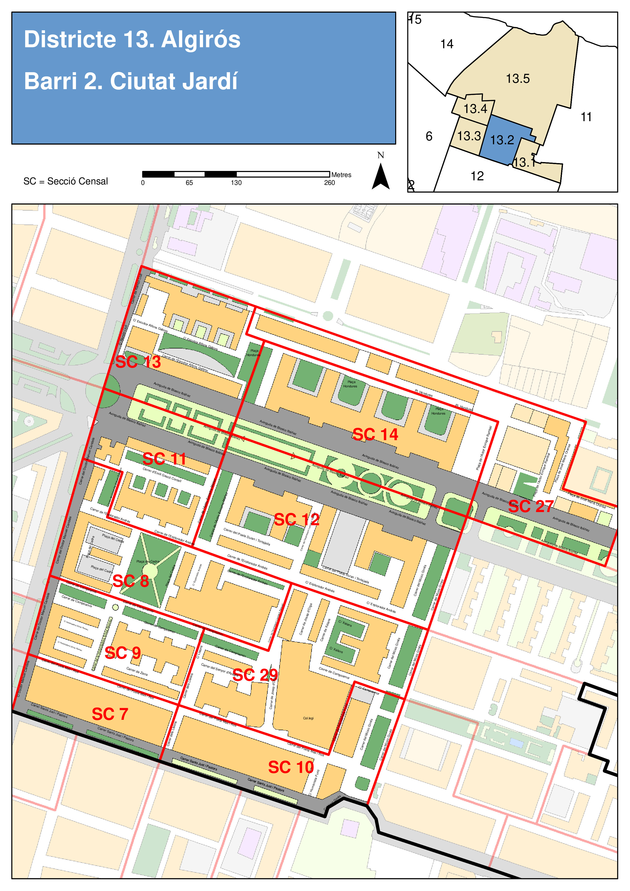 También hay al menos dos áreas verdes identificadas: la calle Poeta Duran i Tortajada (≈3.777 m²) y la calle Actriz Encarna Máñez (≈1.769 m²).