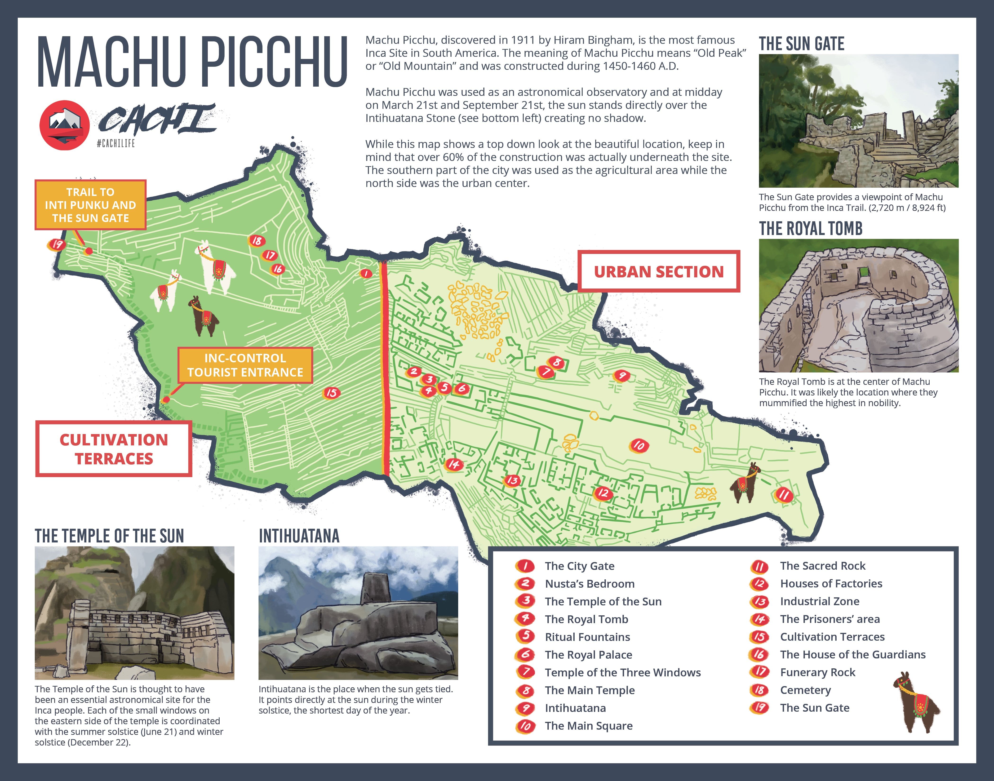 Machu Picchu una ciudadela inca del siglo XV ubicada en la Cordillera Oriental del sur de Perú en una cadena montañosa de 2430 metros sobre el nivel del mar. Está ubicado en el distrito de Machupicchu dentro de la provincia de Urubamba sobre el Valle Sagrado, que se encuentra a 80 kilómetros al noroeste de Cusco. El río Urubamba pasa por allí, atravesando la Cordillera y creando un cañón con un clima tropical de montaña.