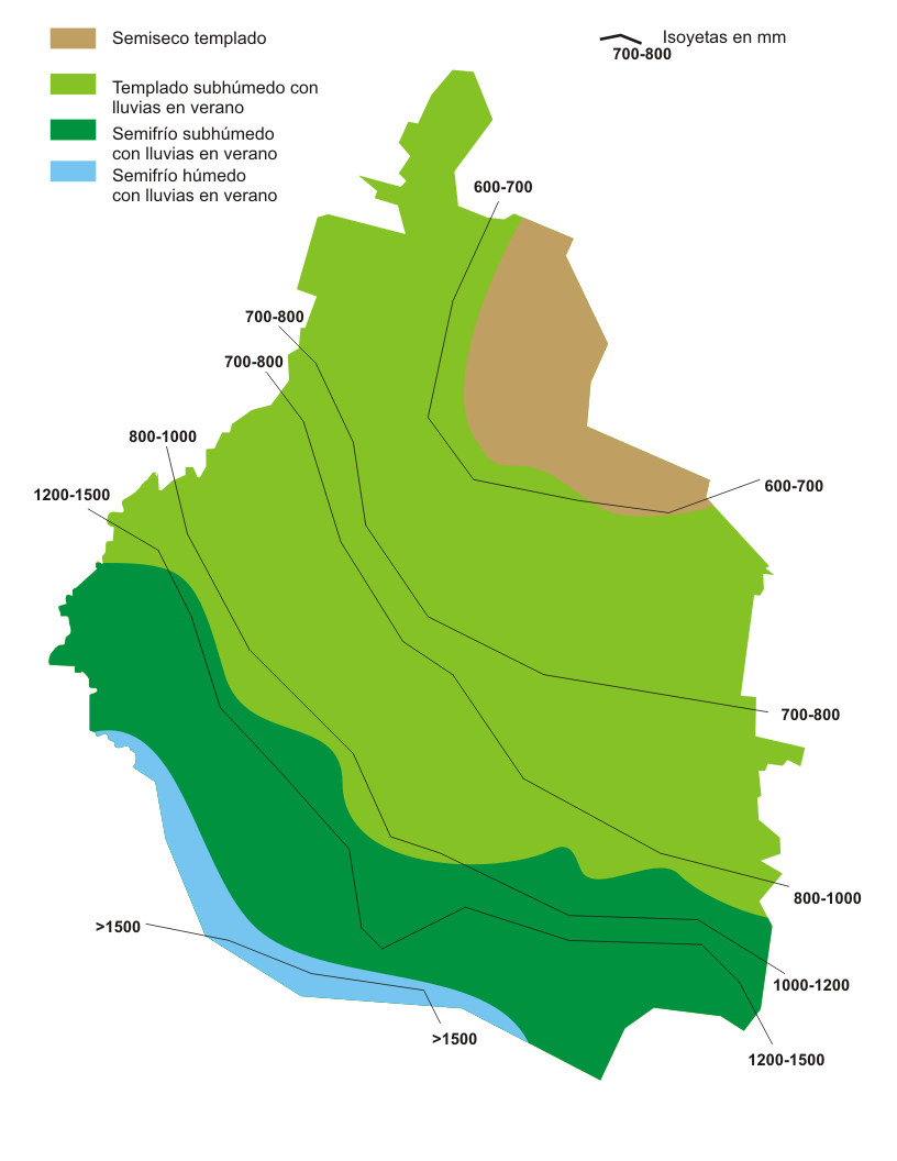 Zona urbana: clima templado con lluvias en verano (temperatura media anual: 15–16 °C).