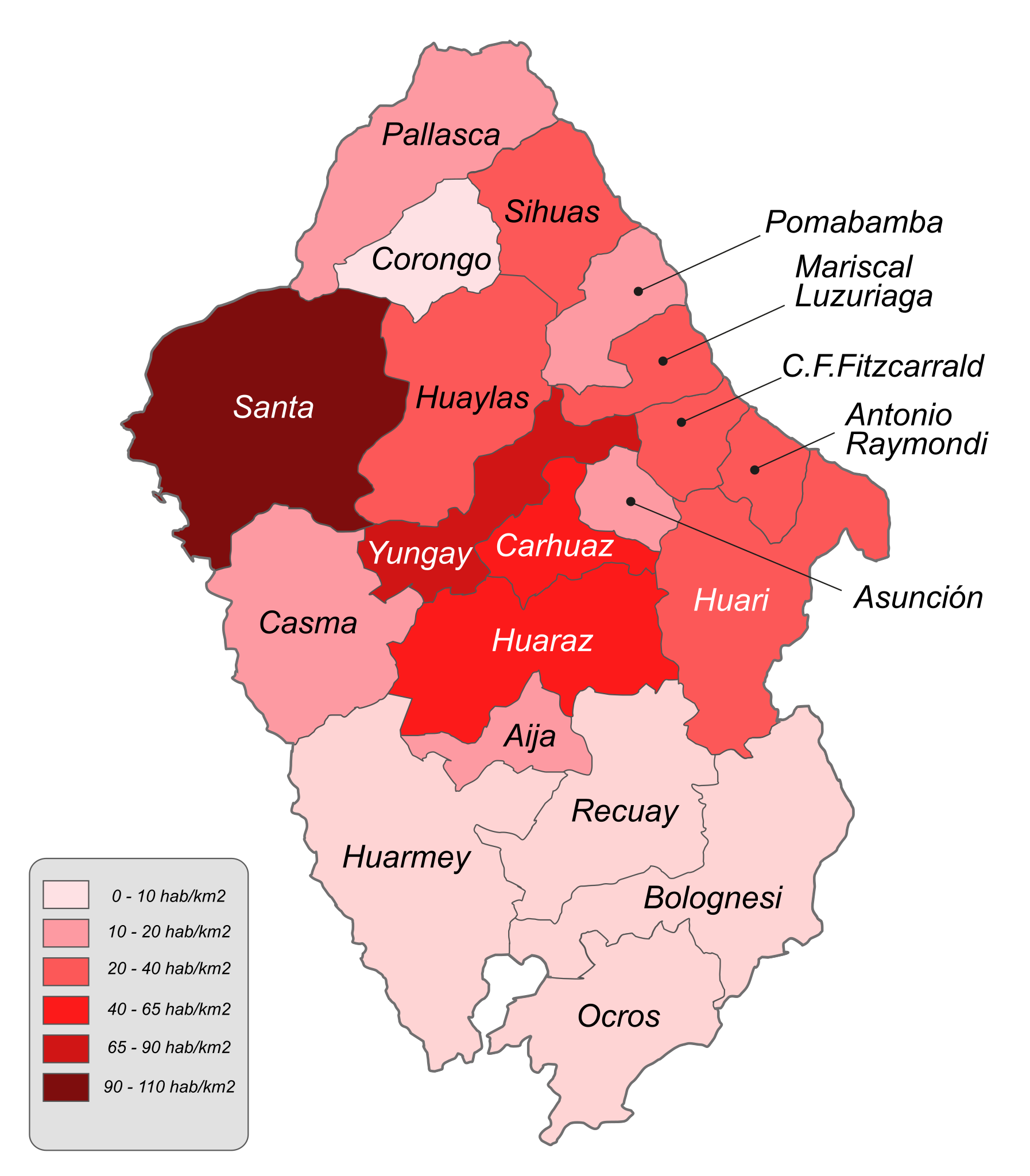 En un análisis de la distribución provincial, es clara la concentración de grandes ciudades en torno al Callejón de Huaylas y el litoral. Destacan en este desequilibrio las provincias de Santa, Huaraz, Huaylas y Yungay respecto al resto de Áncash. Entre estas cuatro provincias se supera ampliamente el 50 %de la población total.